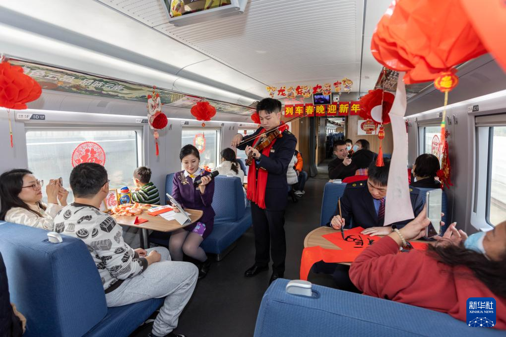 2月9日,在铁路上海客运段G1426次列车举行的“列车春晚迎新年”主题活动上,乘务员为旅客演奏小提琴。新华社记者 王翔 摄