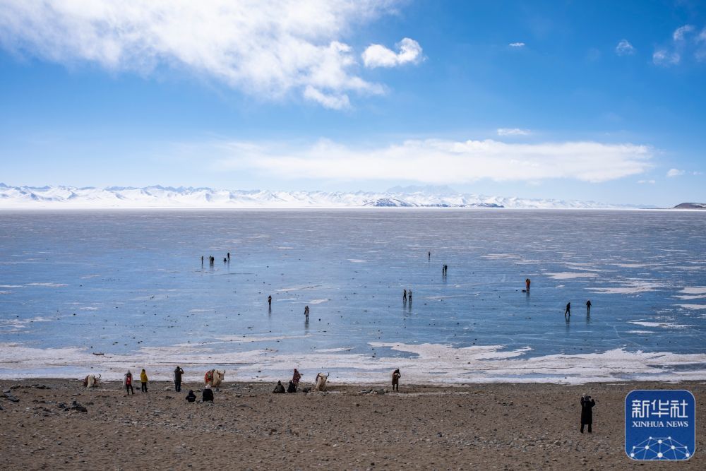 2月8日,游客在结冰的纳木错湖面上游玩。新华社记者 孙非 摄