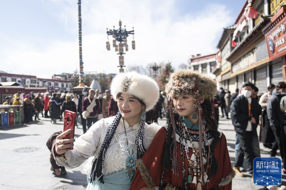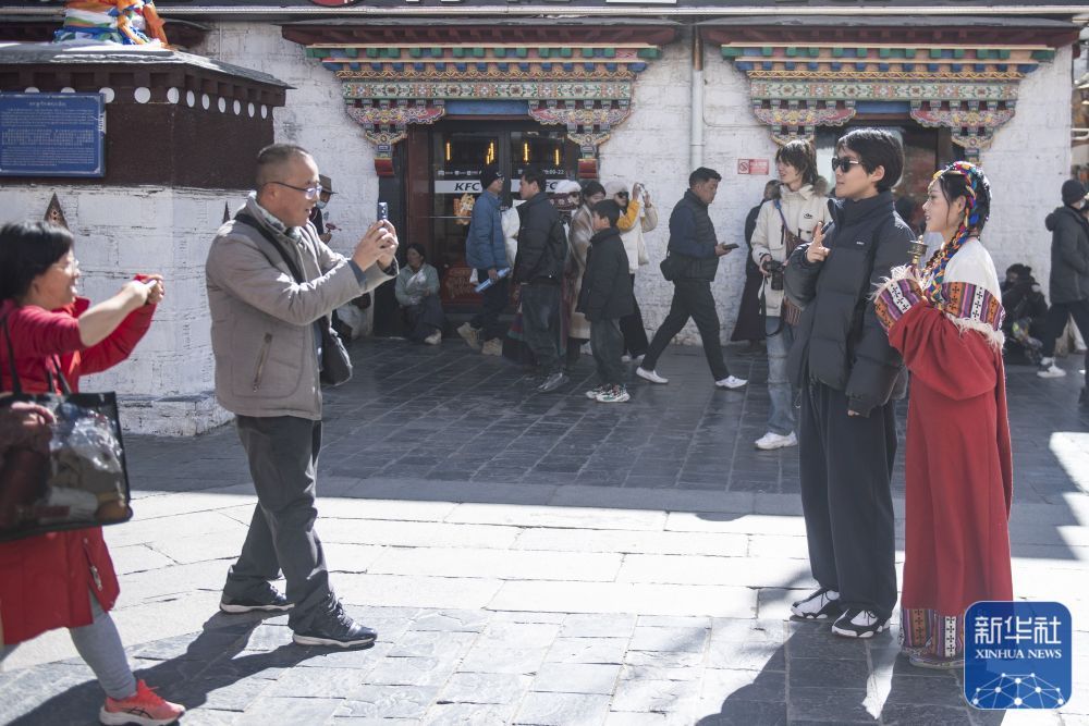 2月11日,游客在西藏拉萨八廓街拍照留念。新华社记者 孙瑞博 摄
