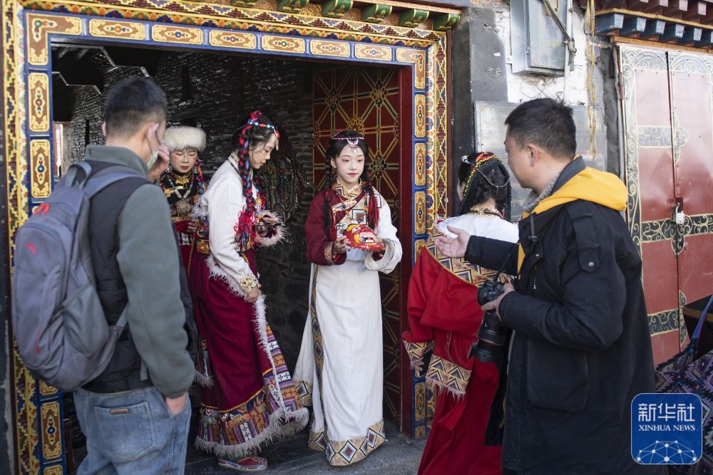 2月11日,在西藏拉萨八廓街,游客准备拍摄藏装纪念照。新华社记者 孙瑞博 摄
