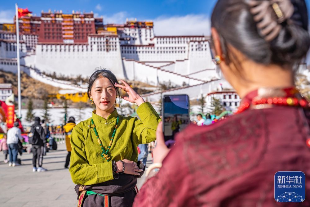 2月11日,来自四川甘孜的游客在布达拉宫广场上拍照留念。新华社记者 孙非 摄