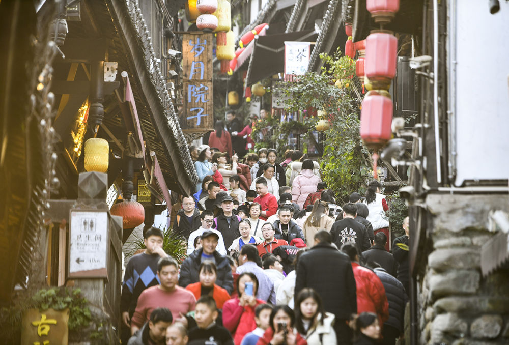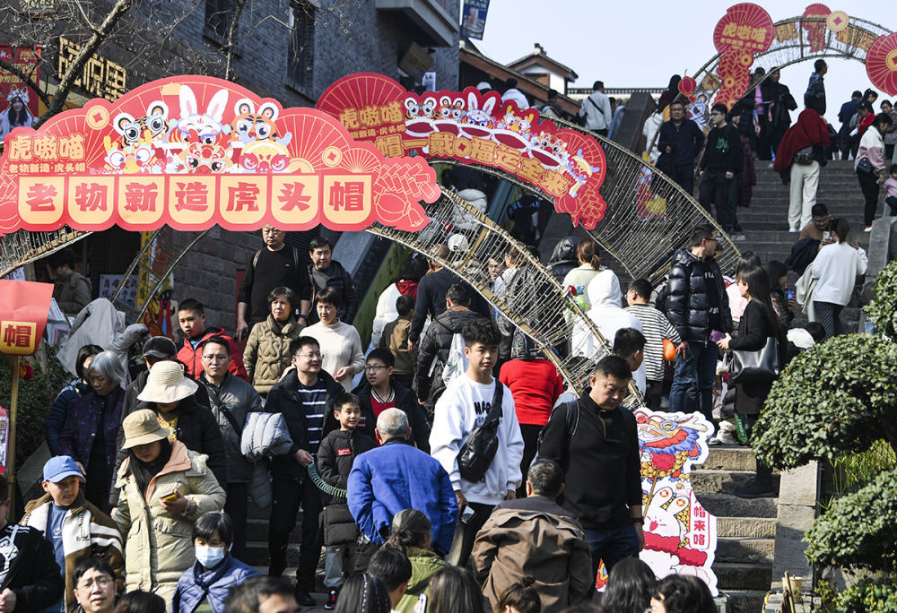 春节假期,重庆千年古镇磁器口游人如织、人气十足。人们逛老街、品美食、体验民俗文化……尽情享受幸福的假期时光。
