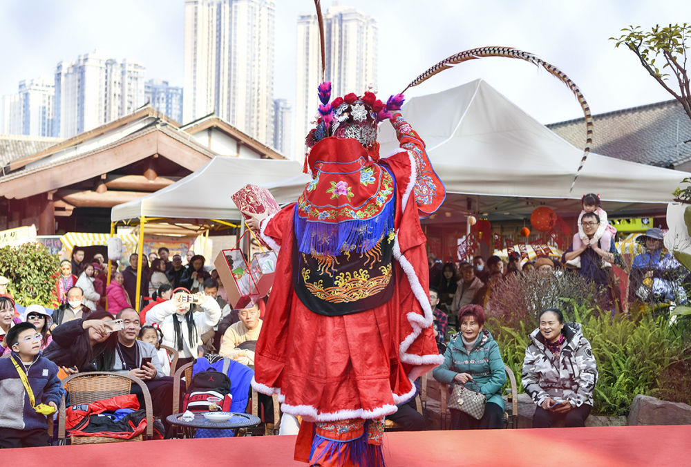 2月11日,游客在重庆磁器口古镇观看民俗表演。