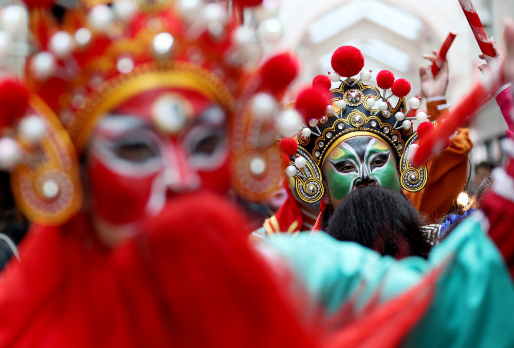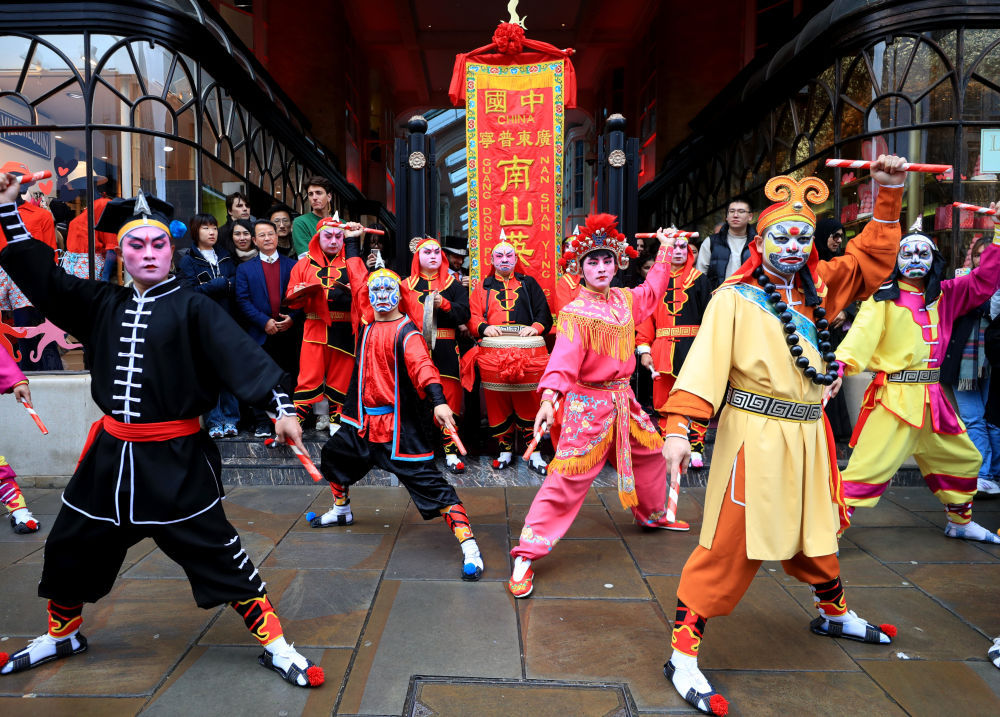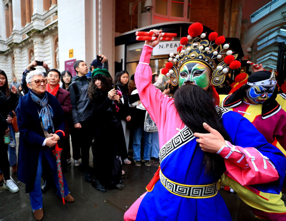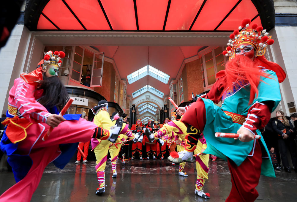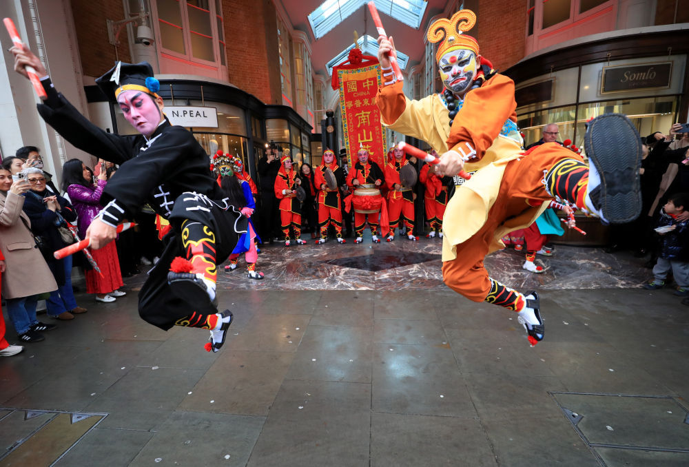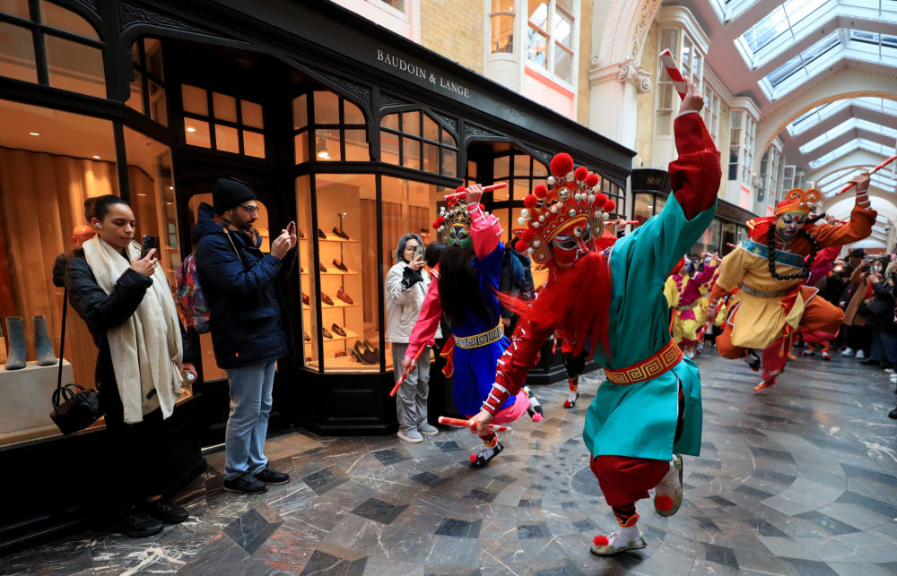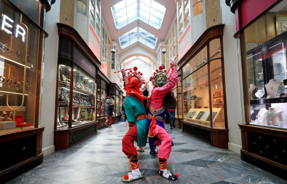 2月10日,演员在英国伦敦伯灵顿拱廊街表演英歌舞。