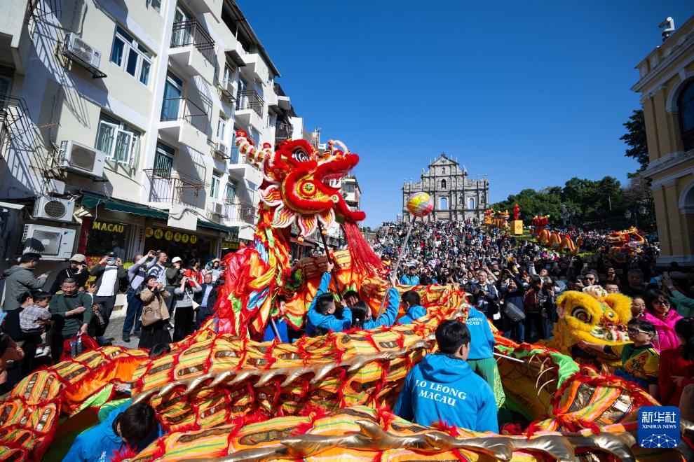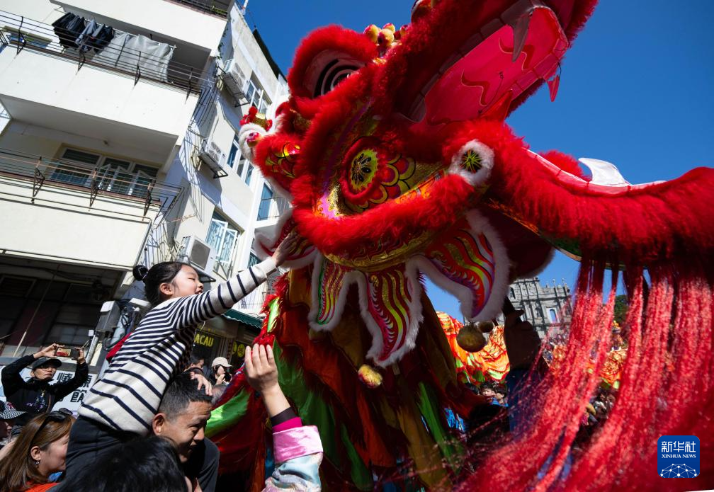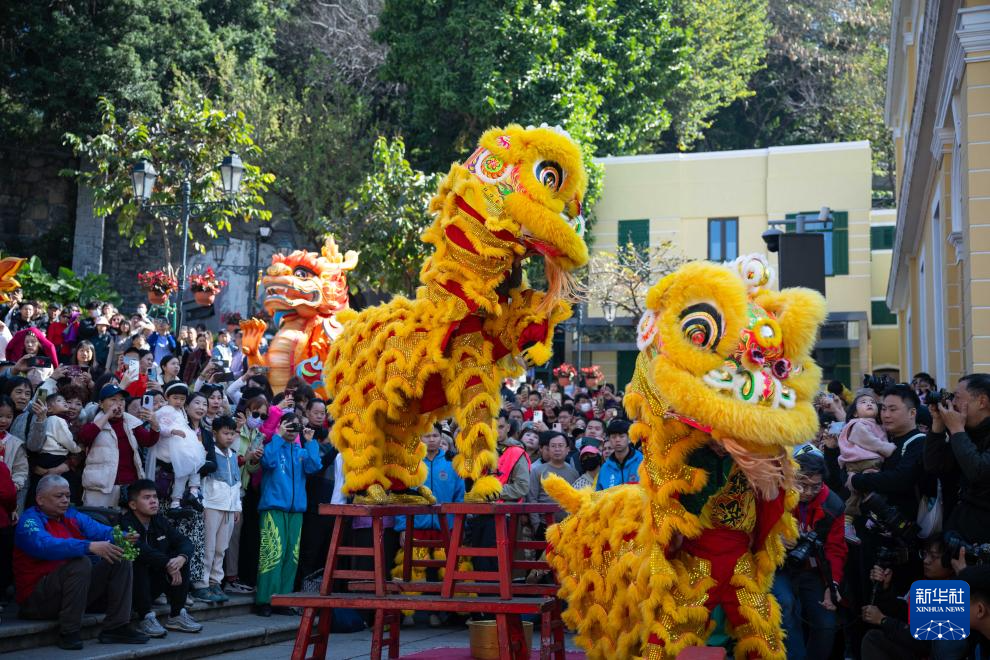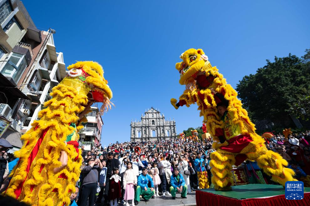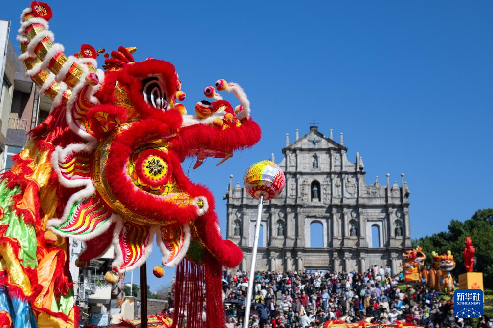 2月11日,澳门旅游局在大三巴牌坊前安排舞龙舞狮贺岁活动,吸引大批市民游客驻足观赏。新华社记者 张金加 摄