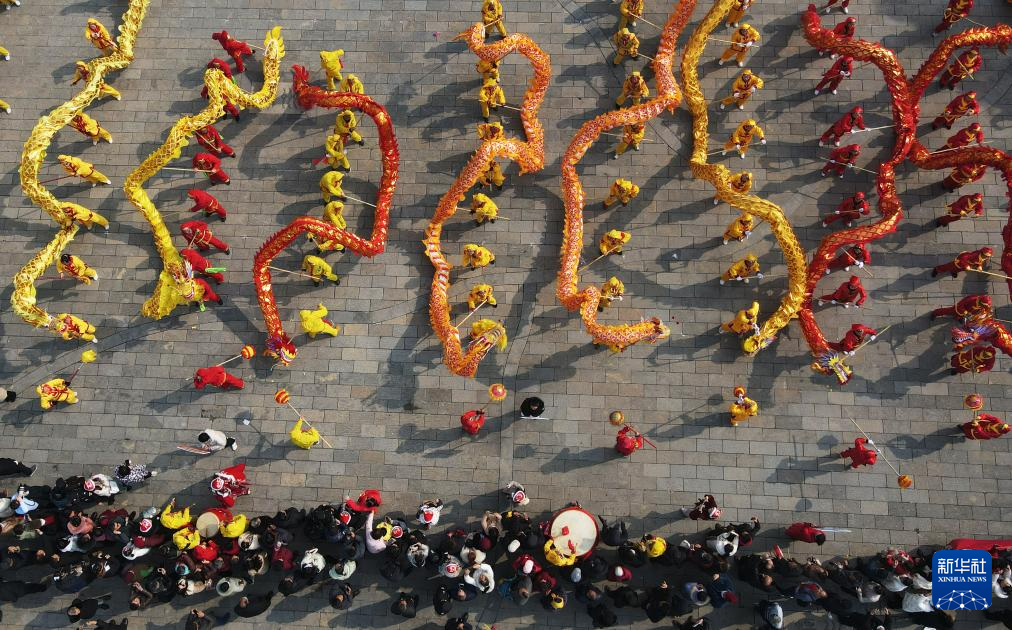 2月11日,民间艺人在江苏省淮安市金湖县尧帝古城表演舞龙(无人机照片)。新华社发(陈义宝摄)