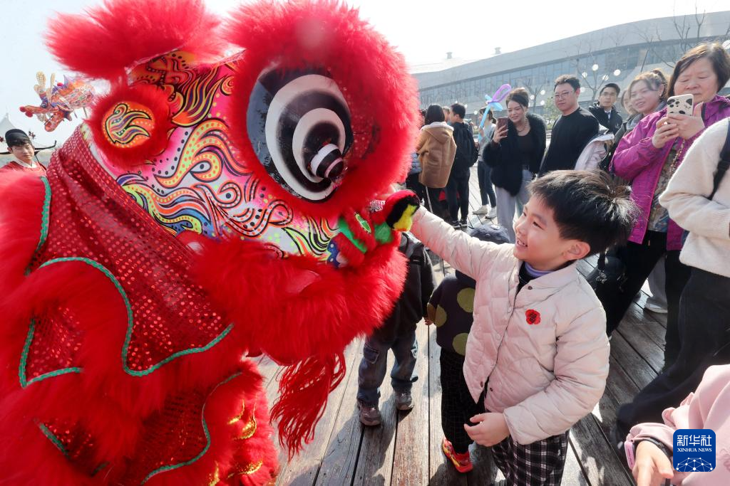 2月11日,在浙江省湖州市德清县,小朋友与舞狮表演队互动。新华社发(谢尚国摄)