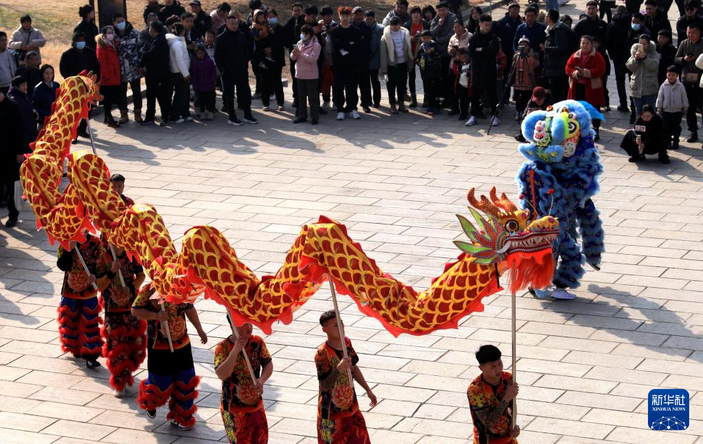 2月11日,在山东省临沂市平邑县蒙山龟蒙景区新春庙会上,人们观看舞龙舞狮表演。新华社发(武纪全摄)