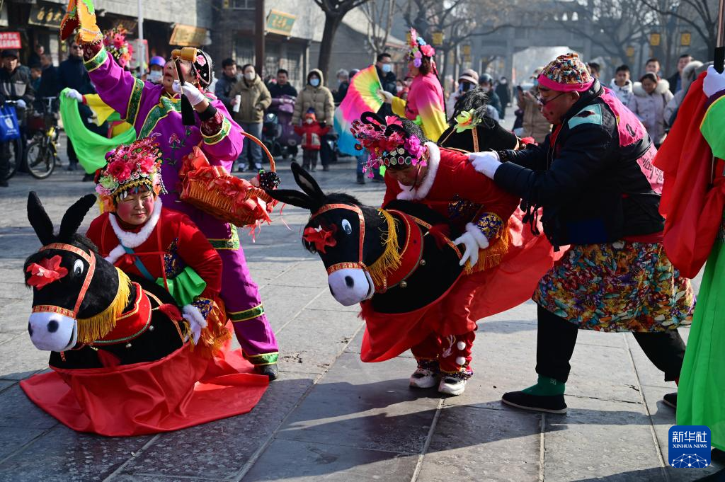2月11日,山东省聊城市东昌府区道口铺街道仙庄村秧歌队在进行民俗表演。新华社发(张振祥摄)
