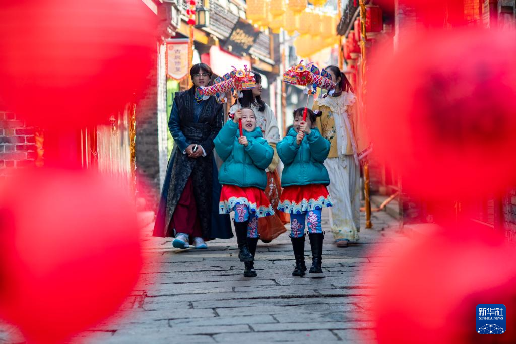 2月11日,一对双胞胎手持龙灯在江苏省兴化市昭阳街道八字桥文旅休闲街区游玩。新华社发(周社根摄)