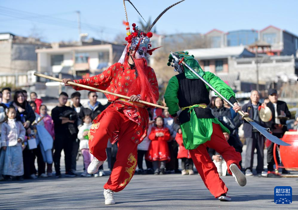 2月11日,河北省石家庄市井陉县南横口村,民间艺人表演传统民俗花脸社火。新华社发(张晓峰 摄)