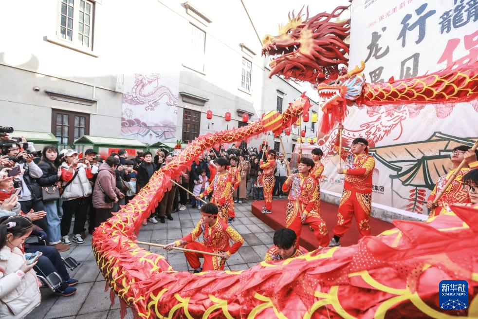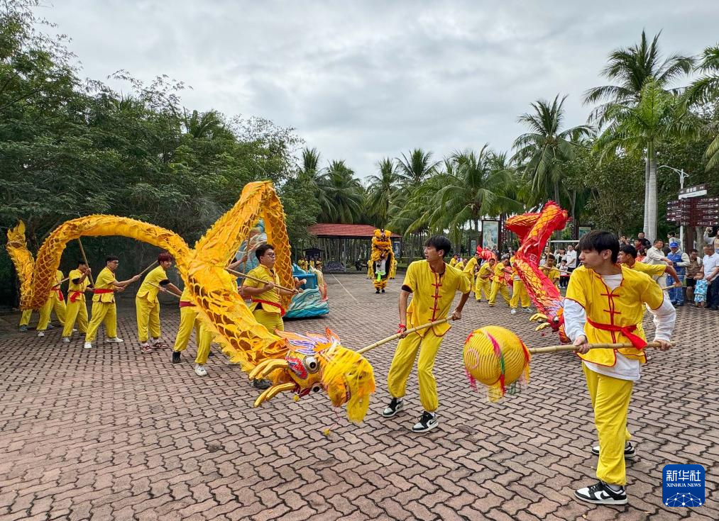 2月11日,演员在海南省三亚市南山文化旅游区表演舞龙。新华社发(郭志华 摄)
