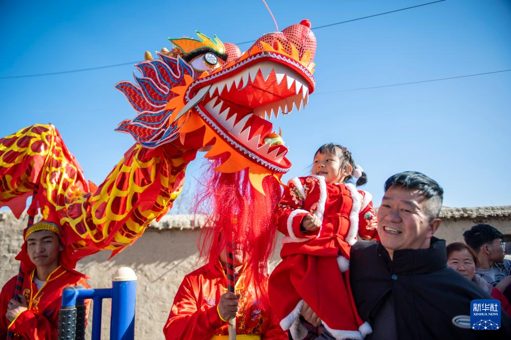 2月11日,甘肃省酒泉市下河清镇紫金村社火队走村串户舞龙耍社火。新华社发(高宏善 摄)