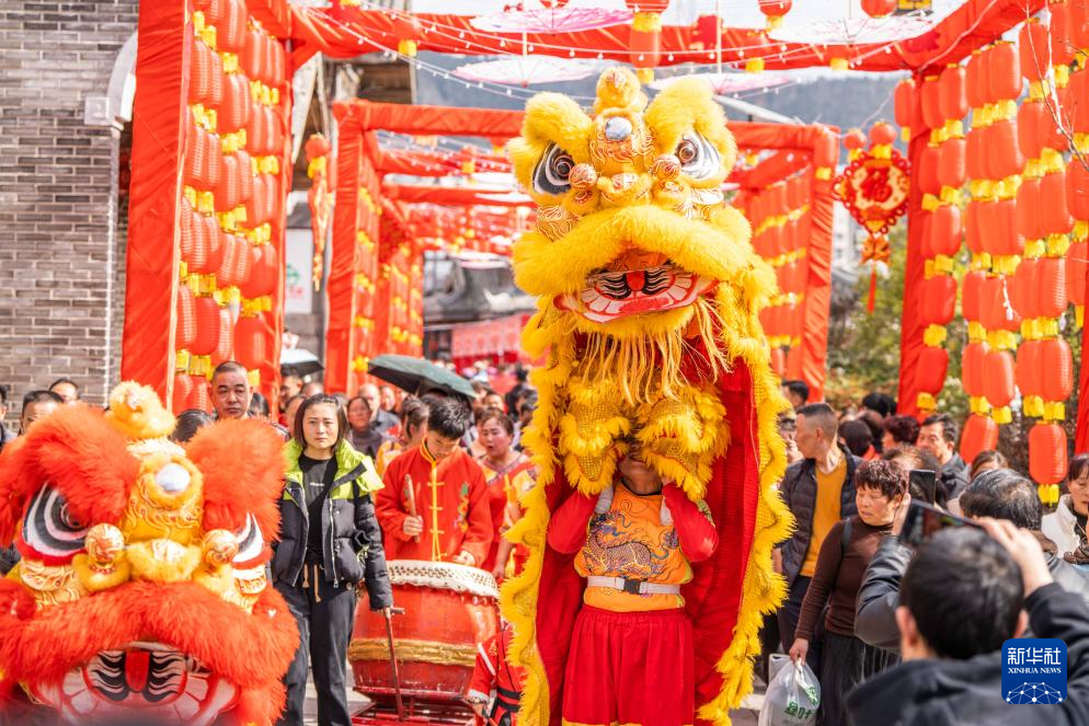 2月11日,游客在贵州省毕节市同心步行街上观看舞狮表演。新华社发(罗大富 摄)
