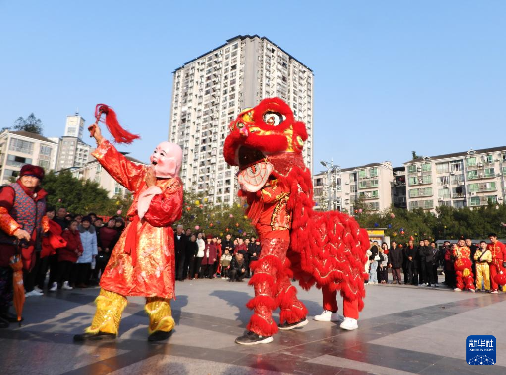 2月11日,四川省达州市渠县渠南街道万兴广场,民间艺人表演狮舞祈福。新华社发(邓良奎 摄)