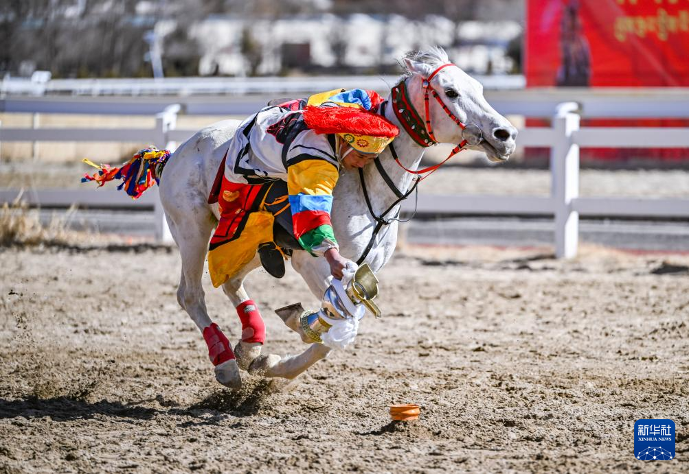 在拉萨赛马场,骑手表演马上拾哈达(2月12日摄)。新华社记者 孙非 摄
