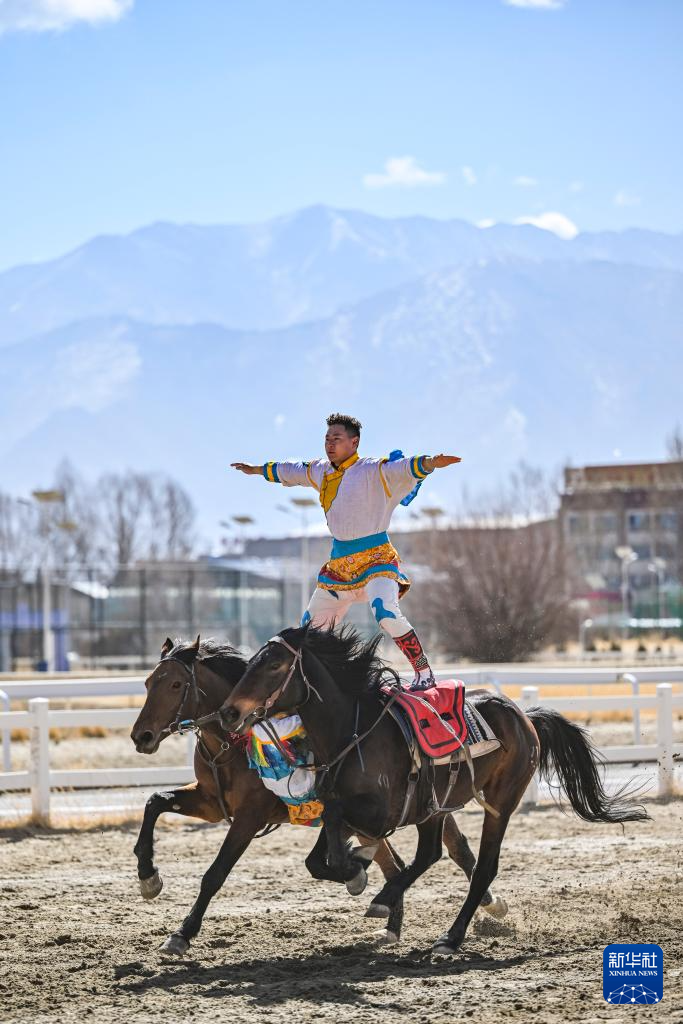 在拉萨赛马场,骑手进行双马单人表演(2月12日摄)。新华社记者 孙非 摄