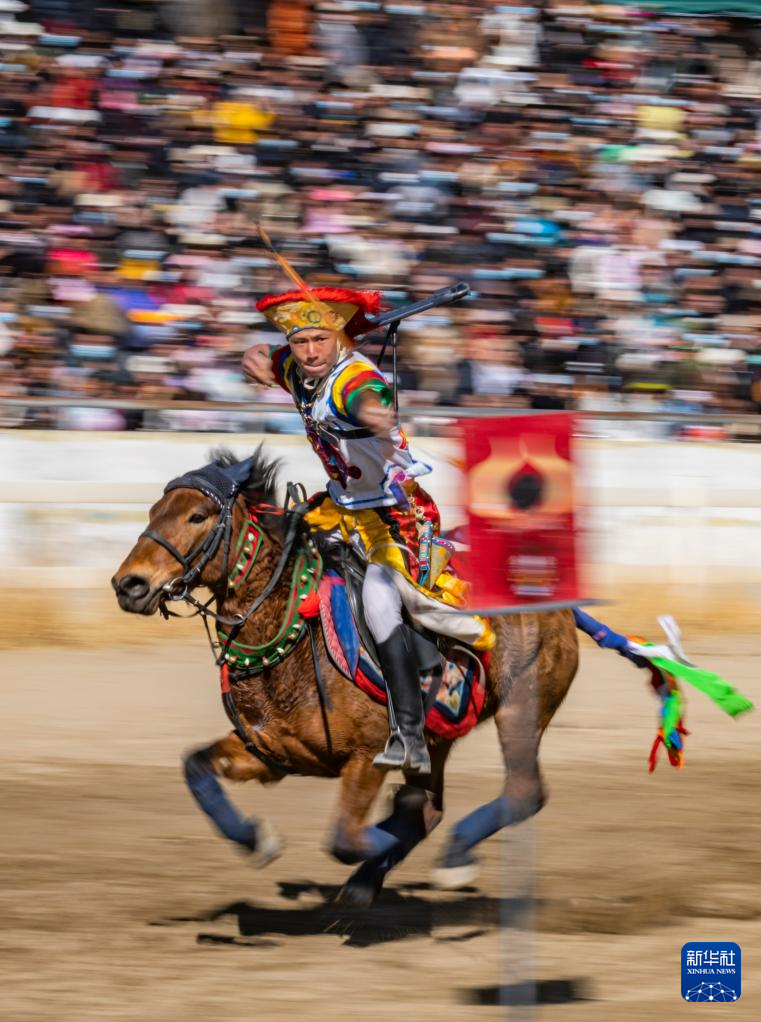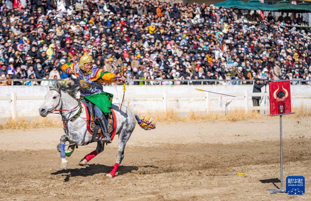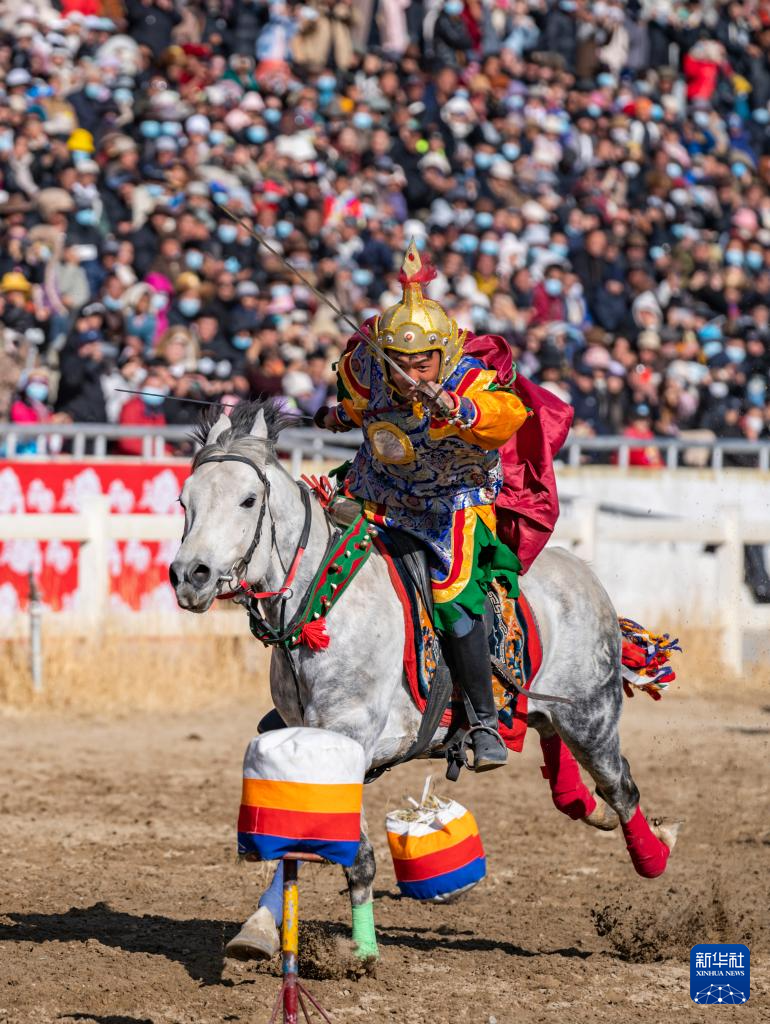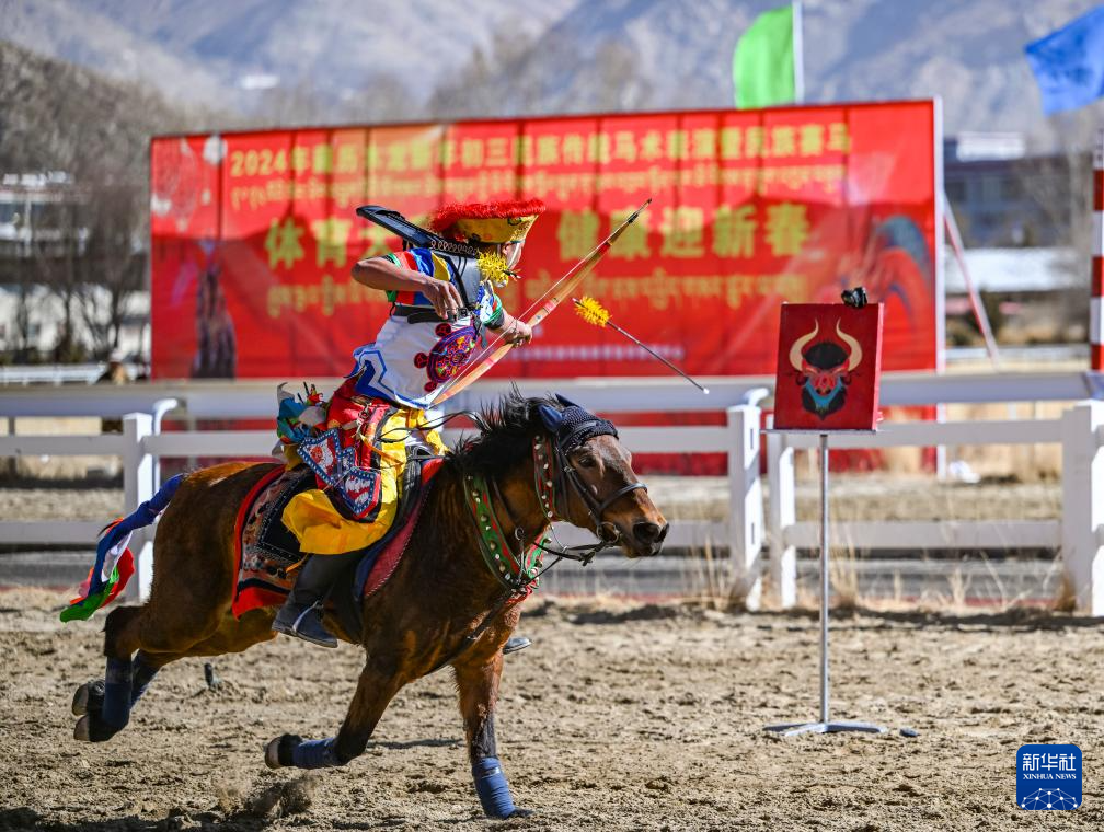 在拉萨赛马场,骑手表演马上射箭(2月12日摄)。新华社记者 孙非 摄