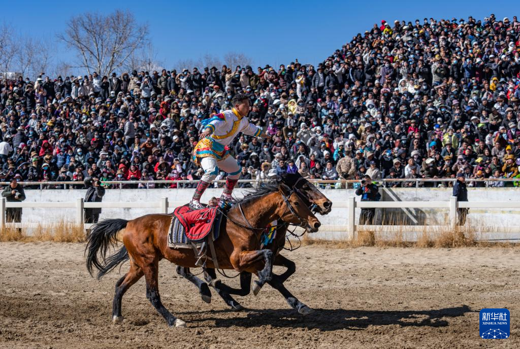 在拉萨赛马场,骑手进行单马双人表演(2月12日摄)。新华社记者 孙瑞博 摄