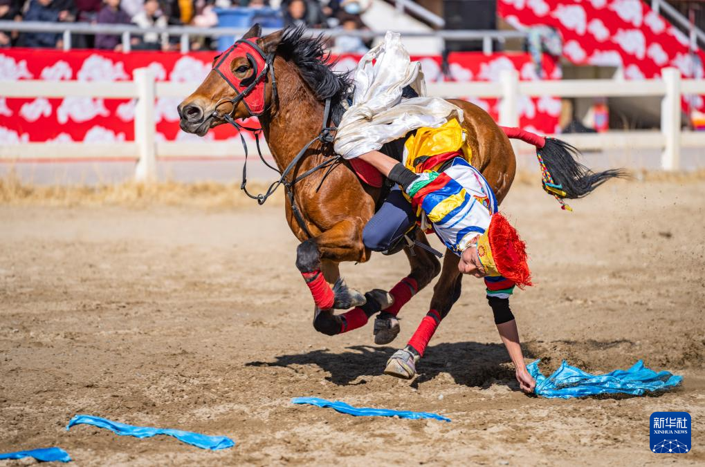 马术在西藏是吉祥、勇敢和智慧的象征。骑手们英姿飒爽,用骑马拾哈达、骑马射箭等精彩表演为观众送上新年的祝福。