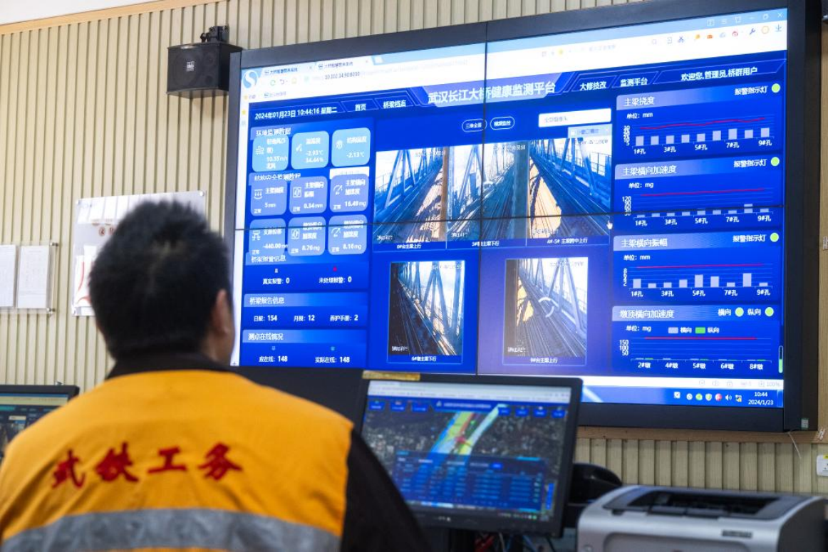 进入高铁时代,随着技术的发展与进步,大桥养修标准提升,养护水平不断提高。在武汉长江大桥桥梁车间办公楼一楼的主控室,大屏上显示着大桥数十处关键处所监控画面,大桥上桥梁防撞监控系统和桥梁健康监测系统的各项数据实时更新。