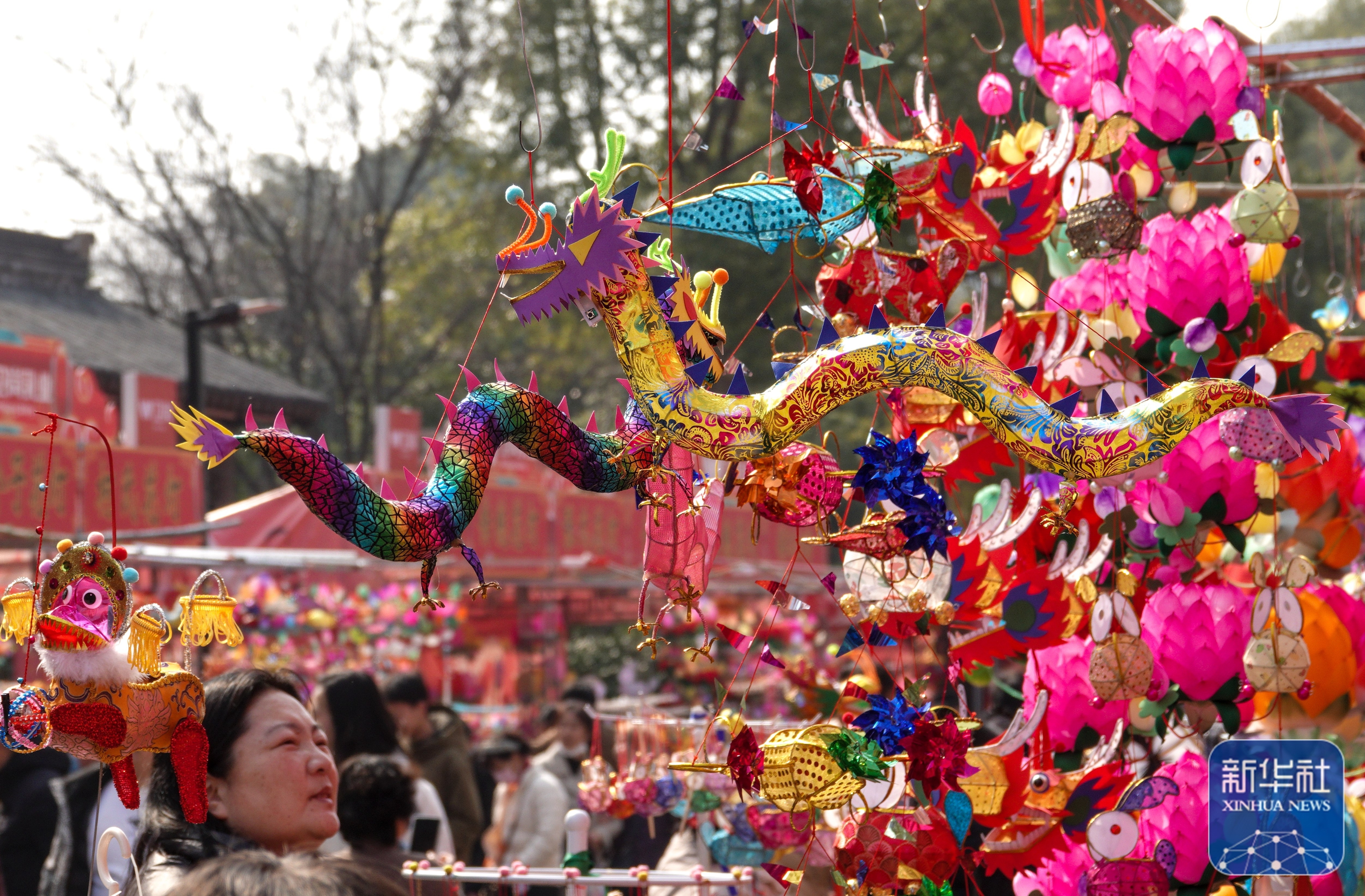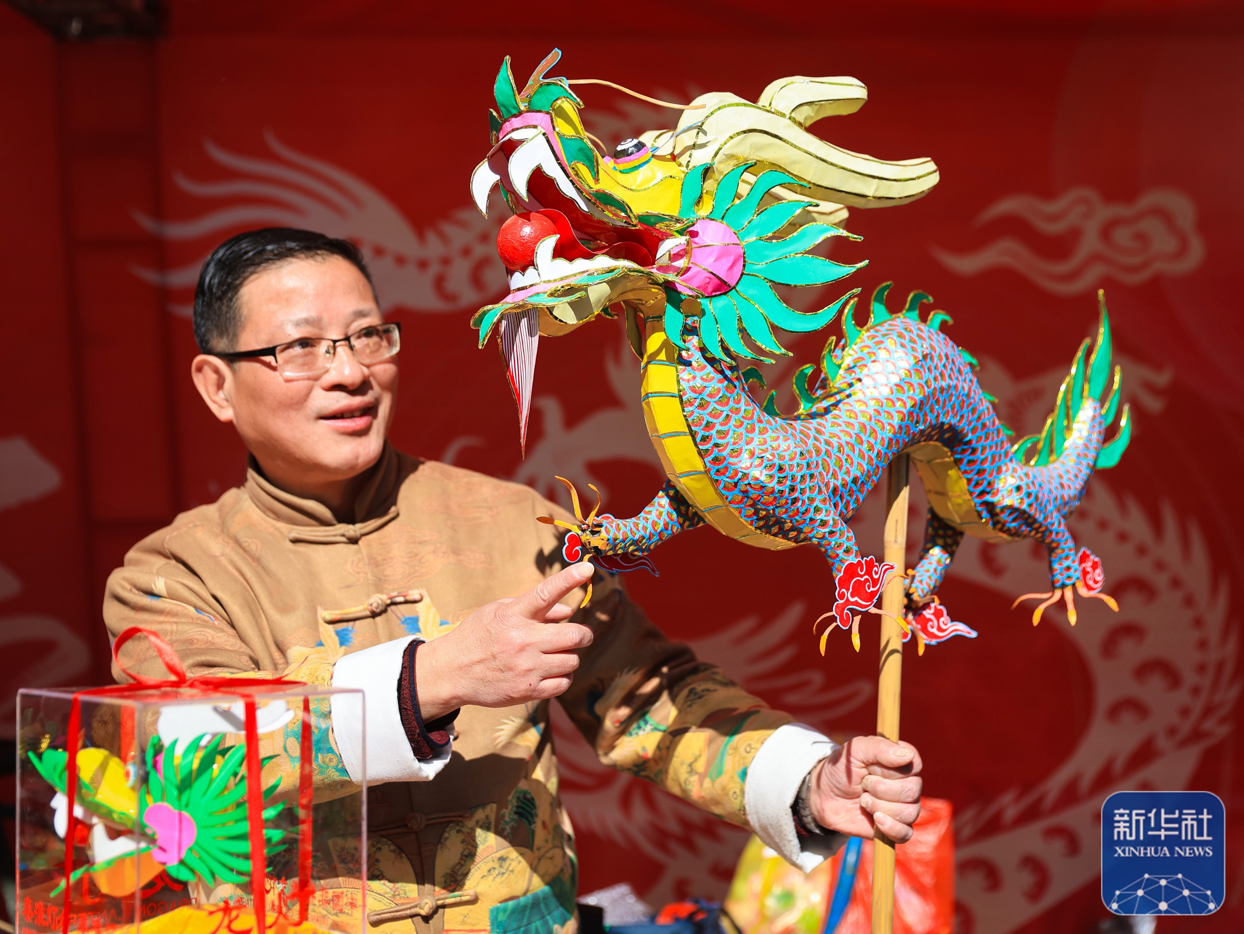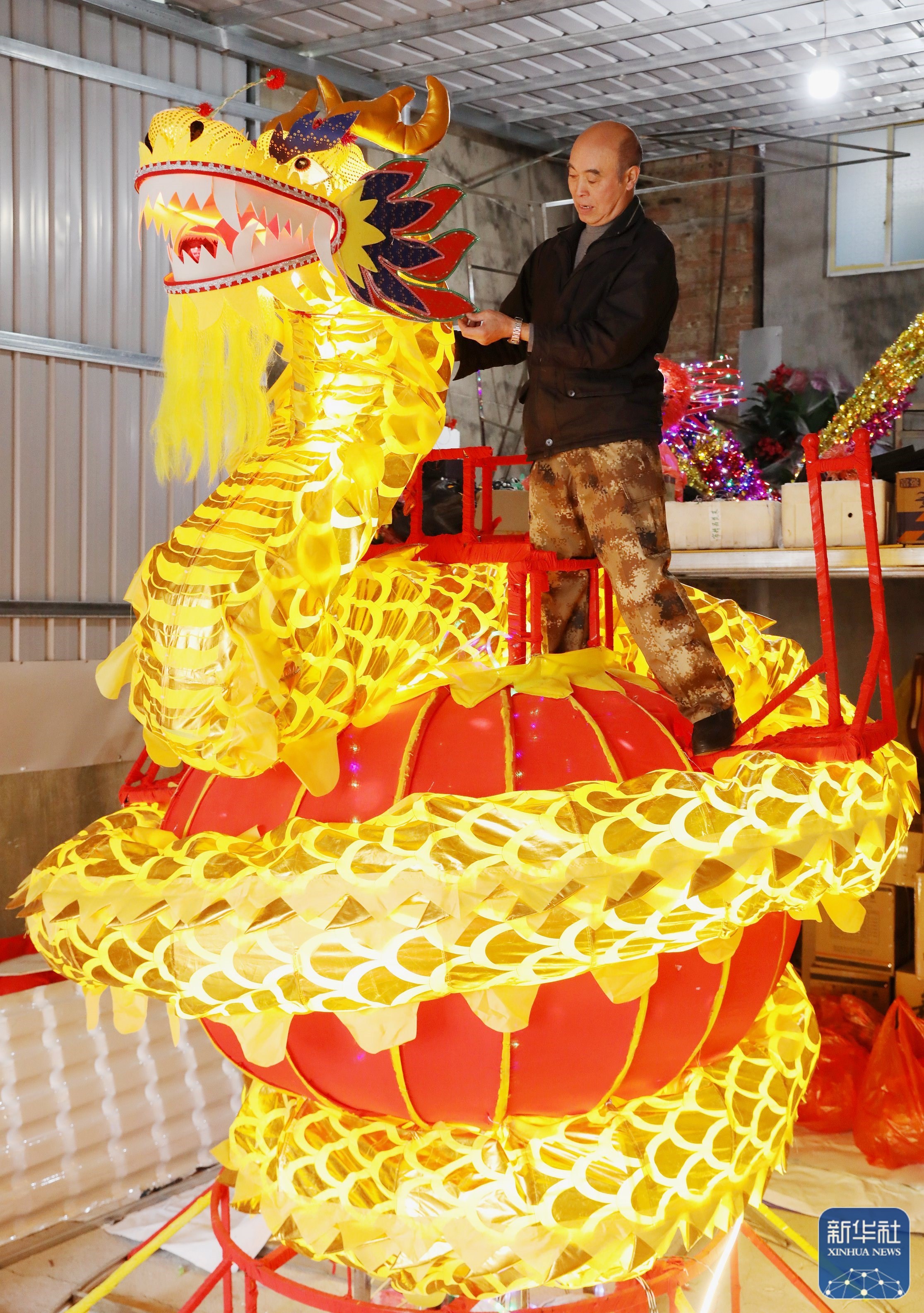 2月12日,在南京夫子庙花灯市场,灯彩艺人顾叶广展示制作的龙灯。新华社发(苏阳摄)