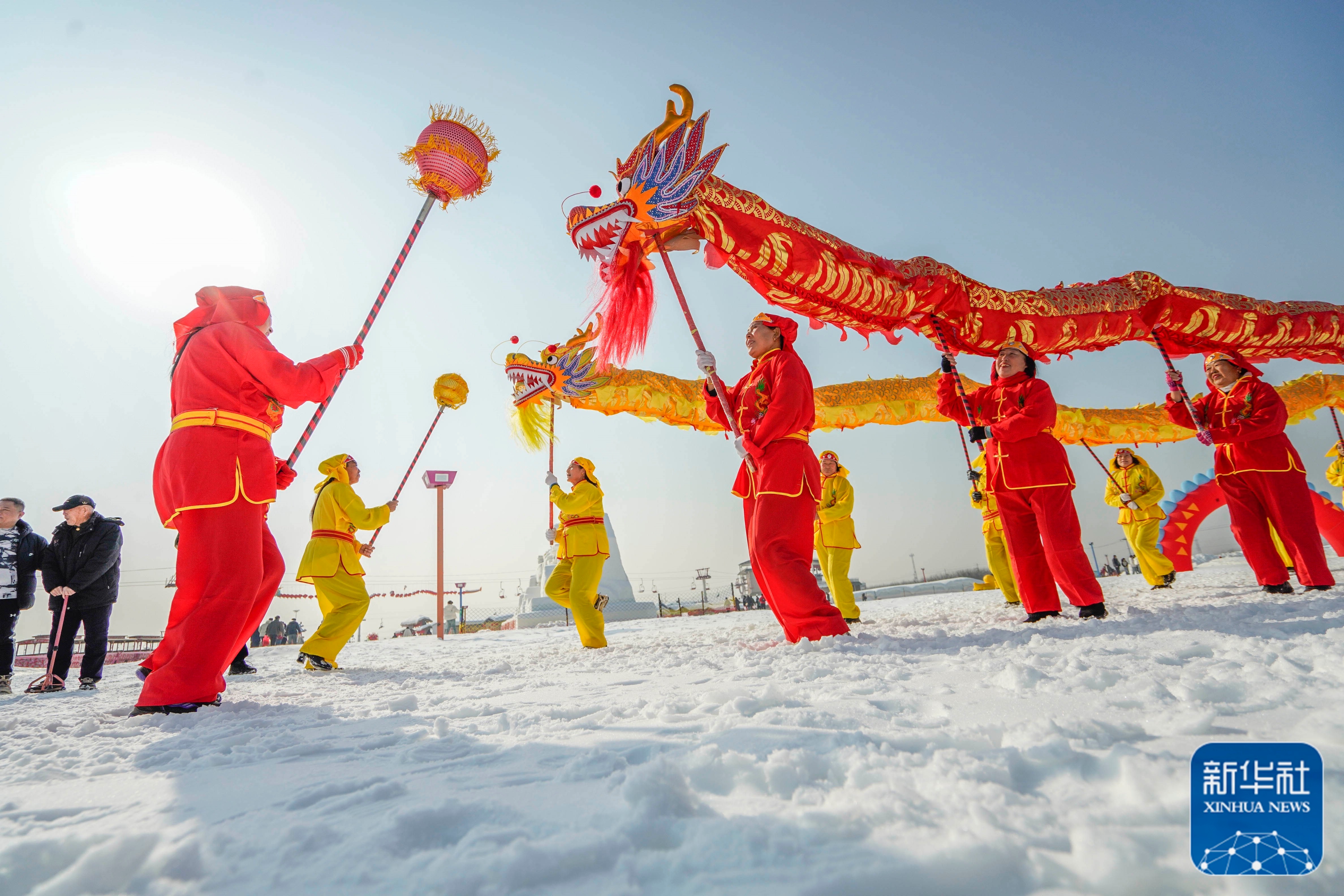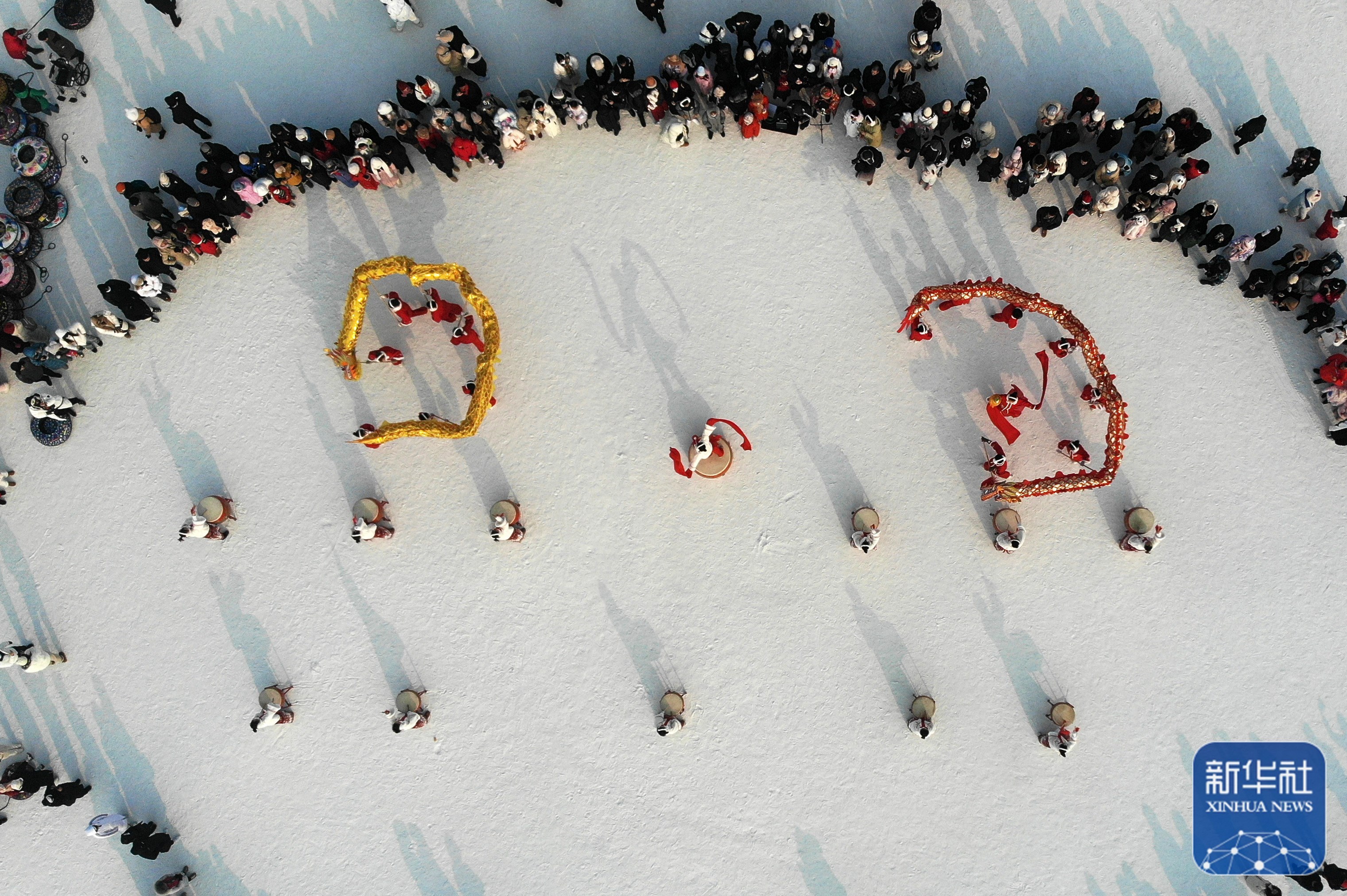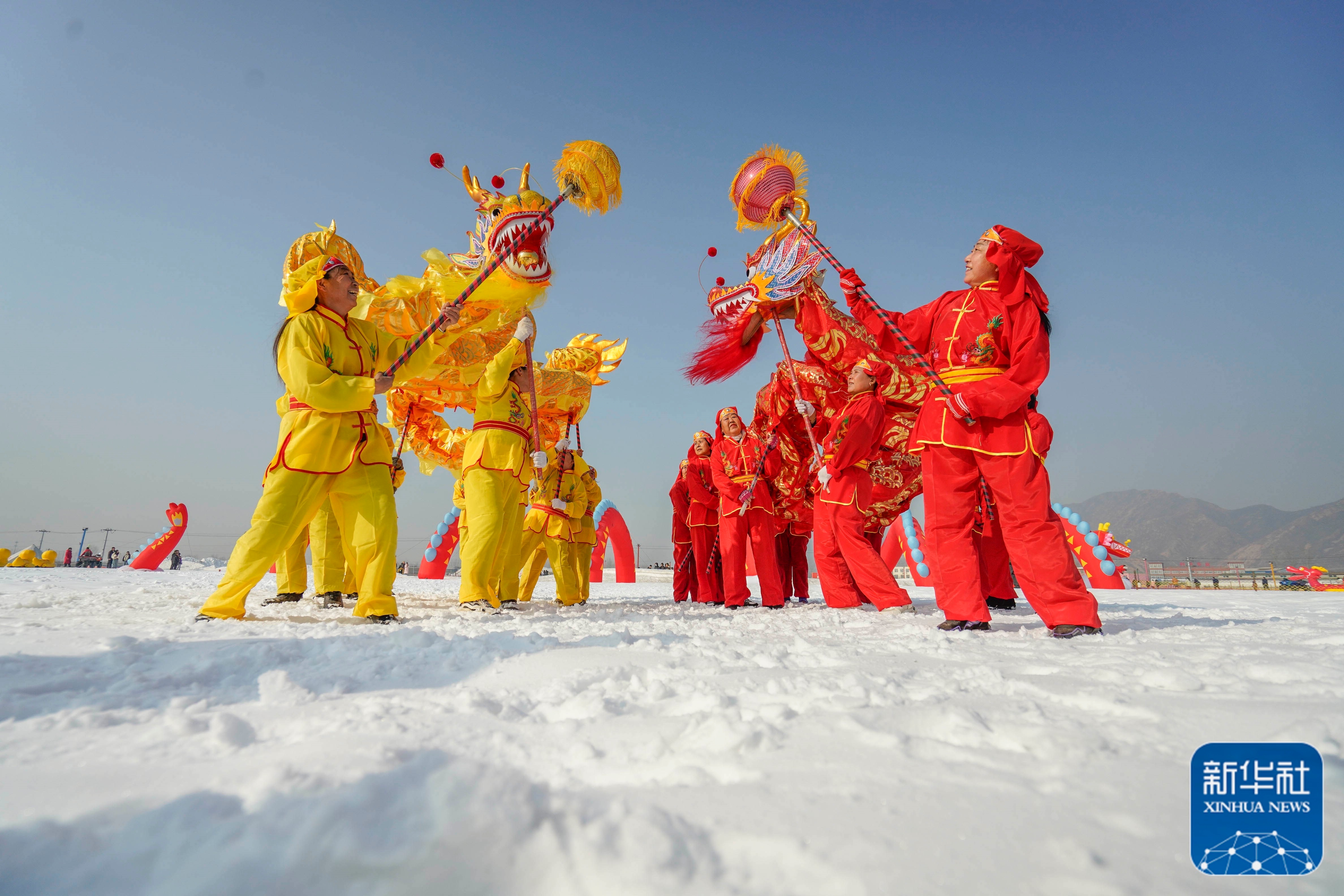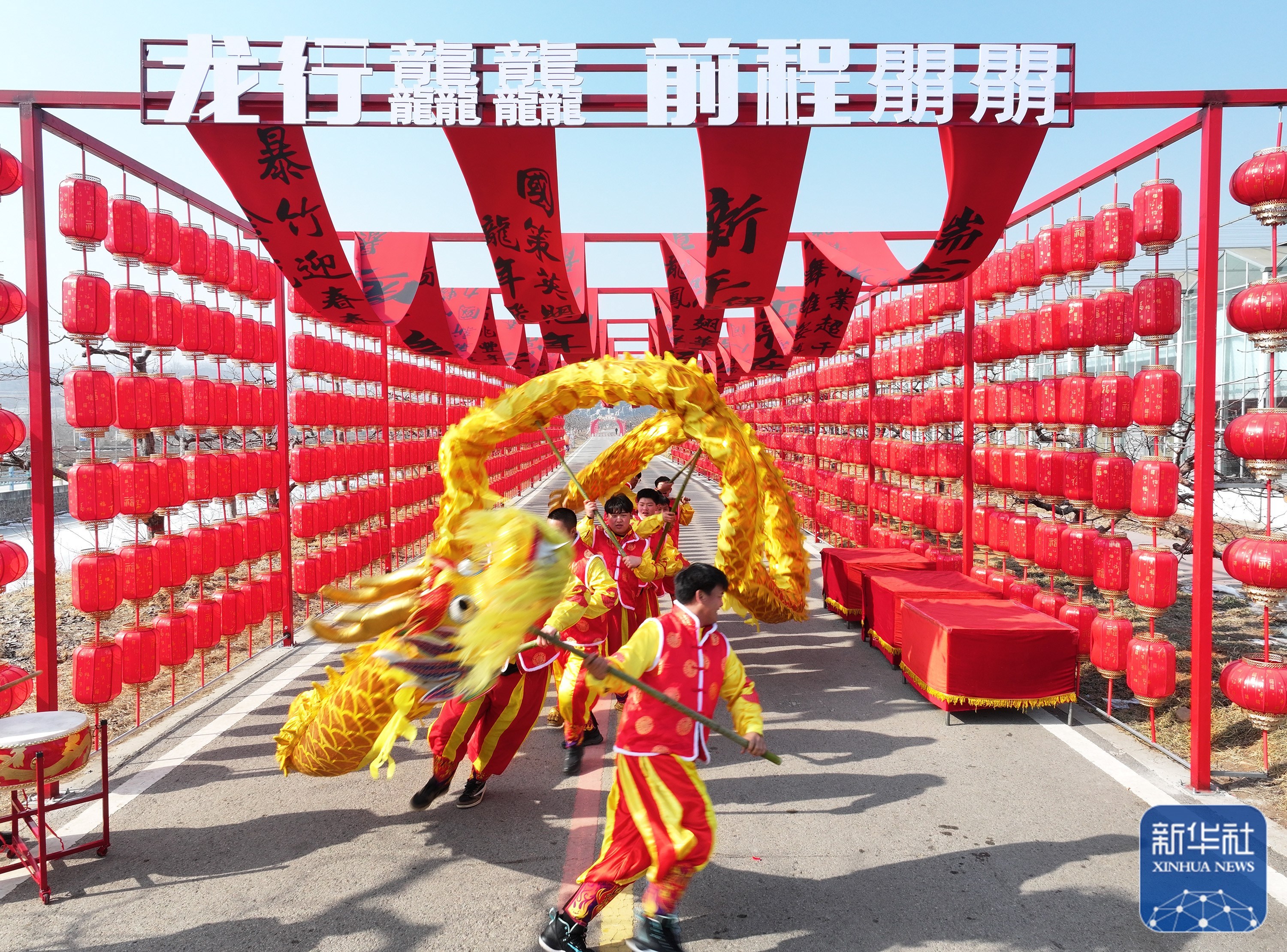 2月12日在河北省唐山市迁西县五海庄园景区拍摄的耍龙表演。新华社发(王爱军摄)