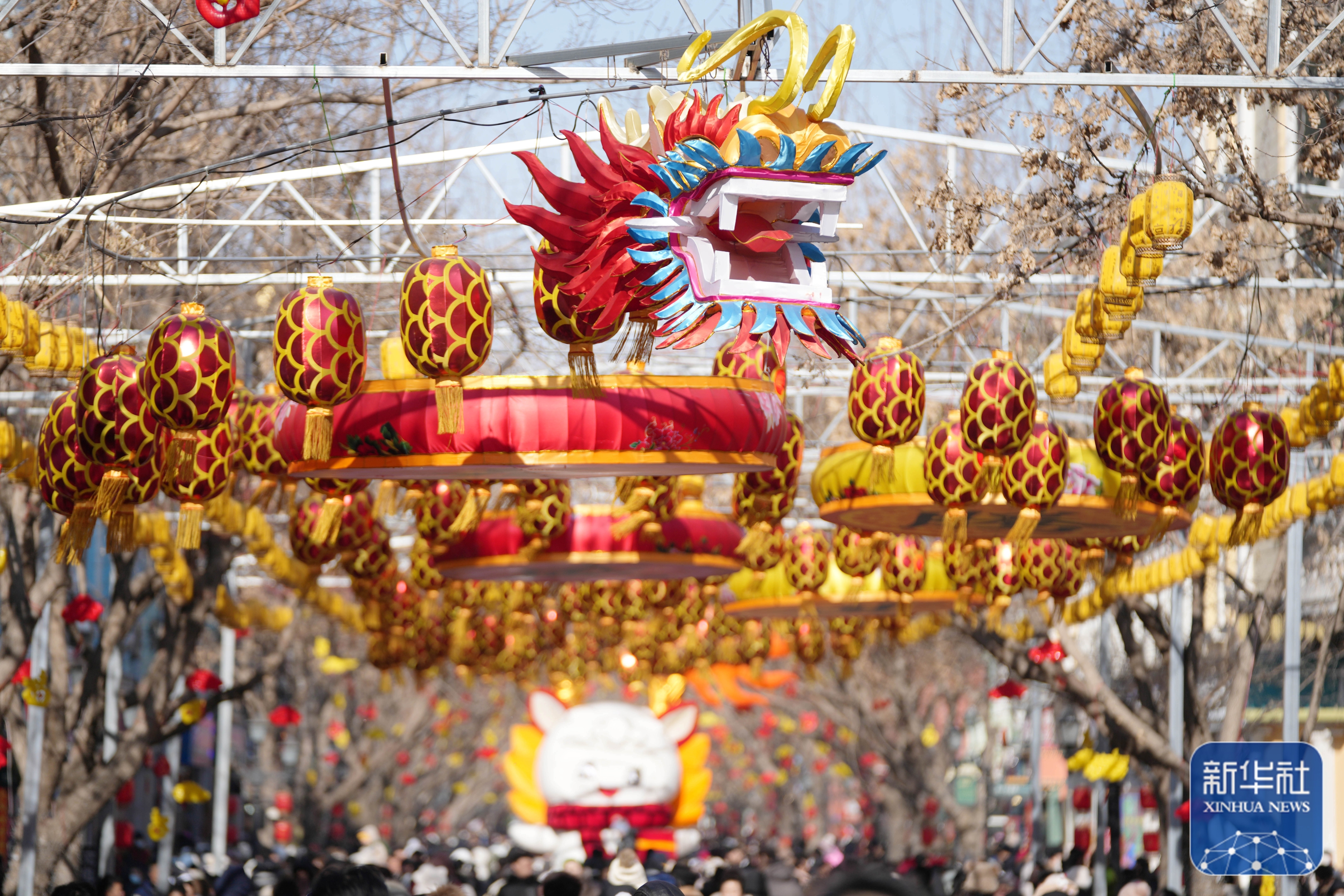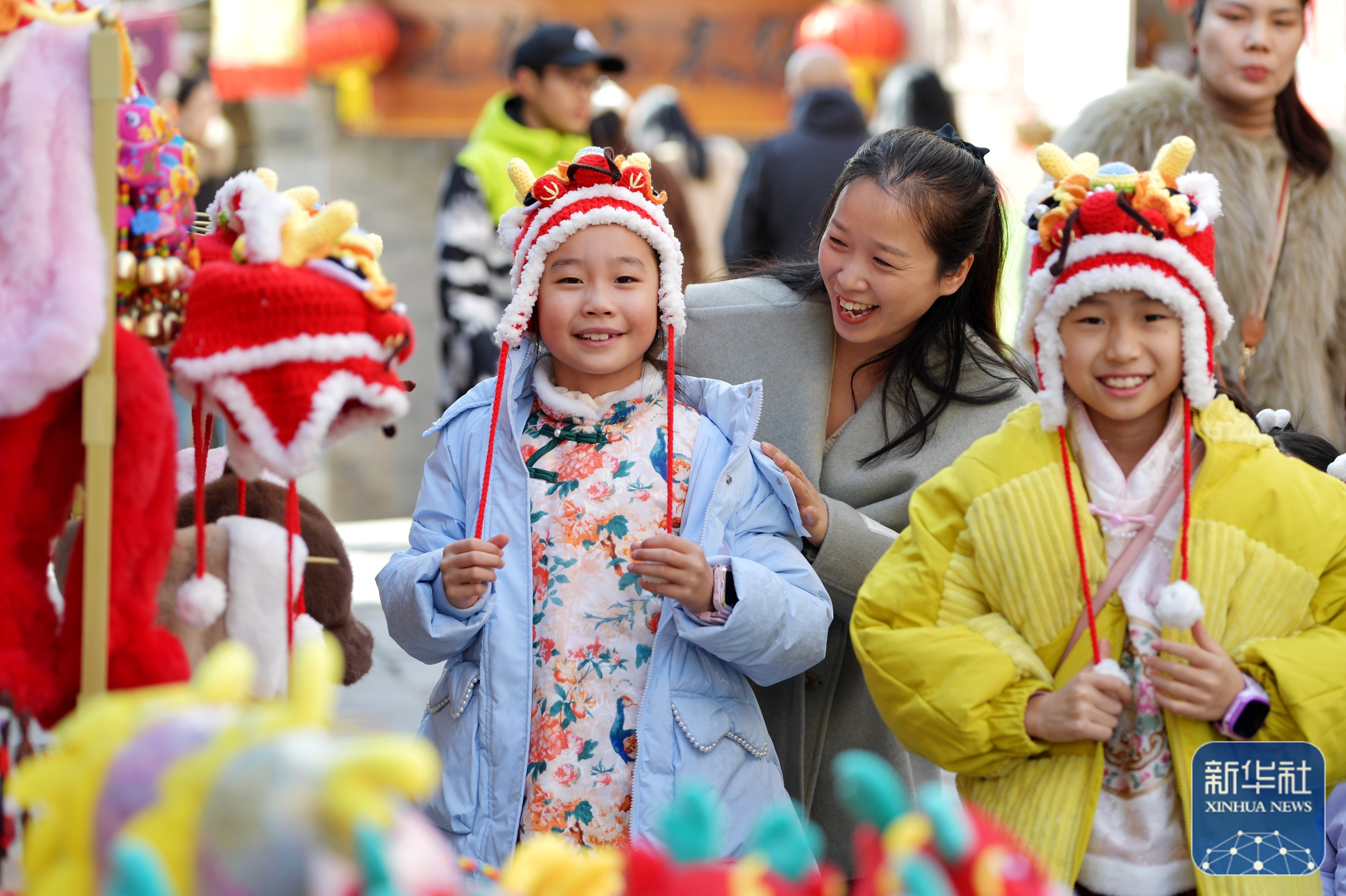 2月12日,在石家庄市土门关驿道小镇,孩子们戴上龙头帽,感受新春年味儿。新华社发(张晓峰摄)