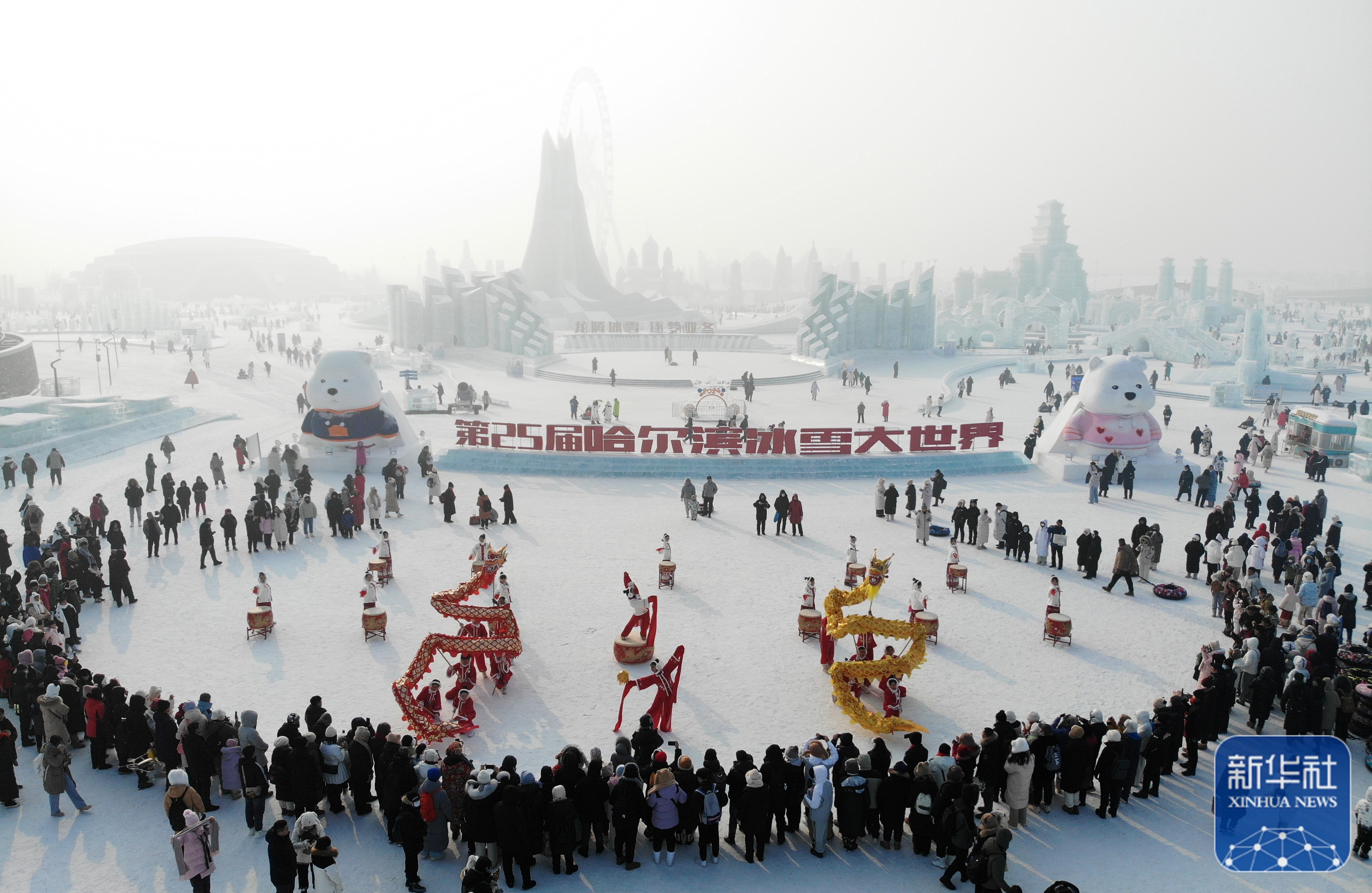 2月10日,在哈尔滨冰雪大世界园区内,游客观看舞龙表演(无人机照片)。新华社记者 王建威 摄