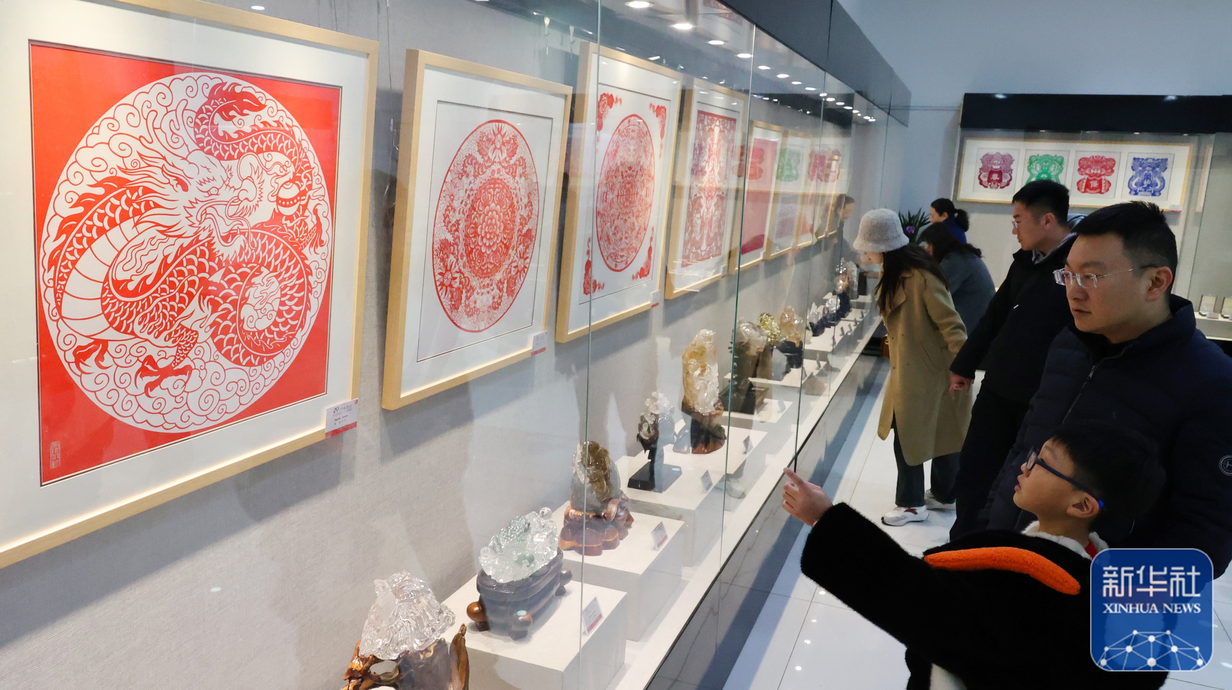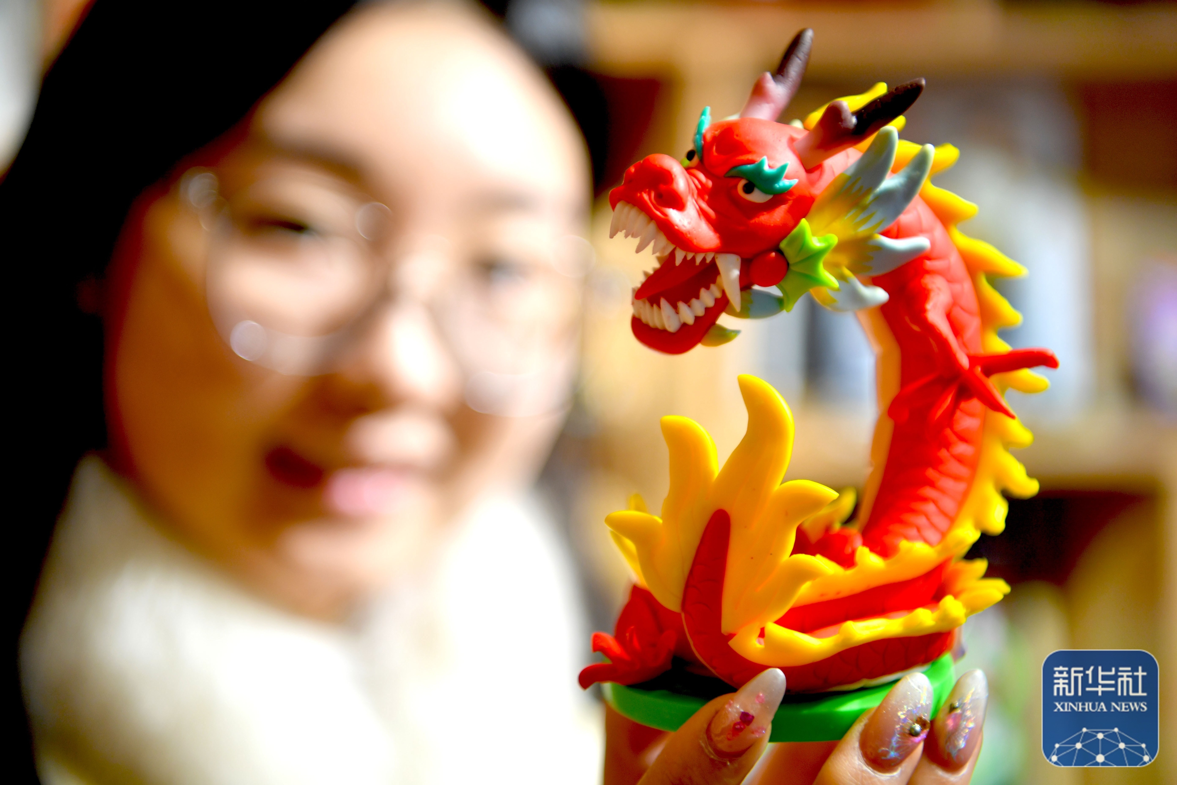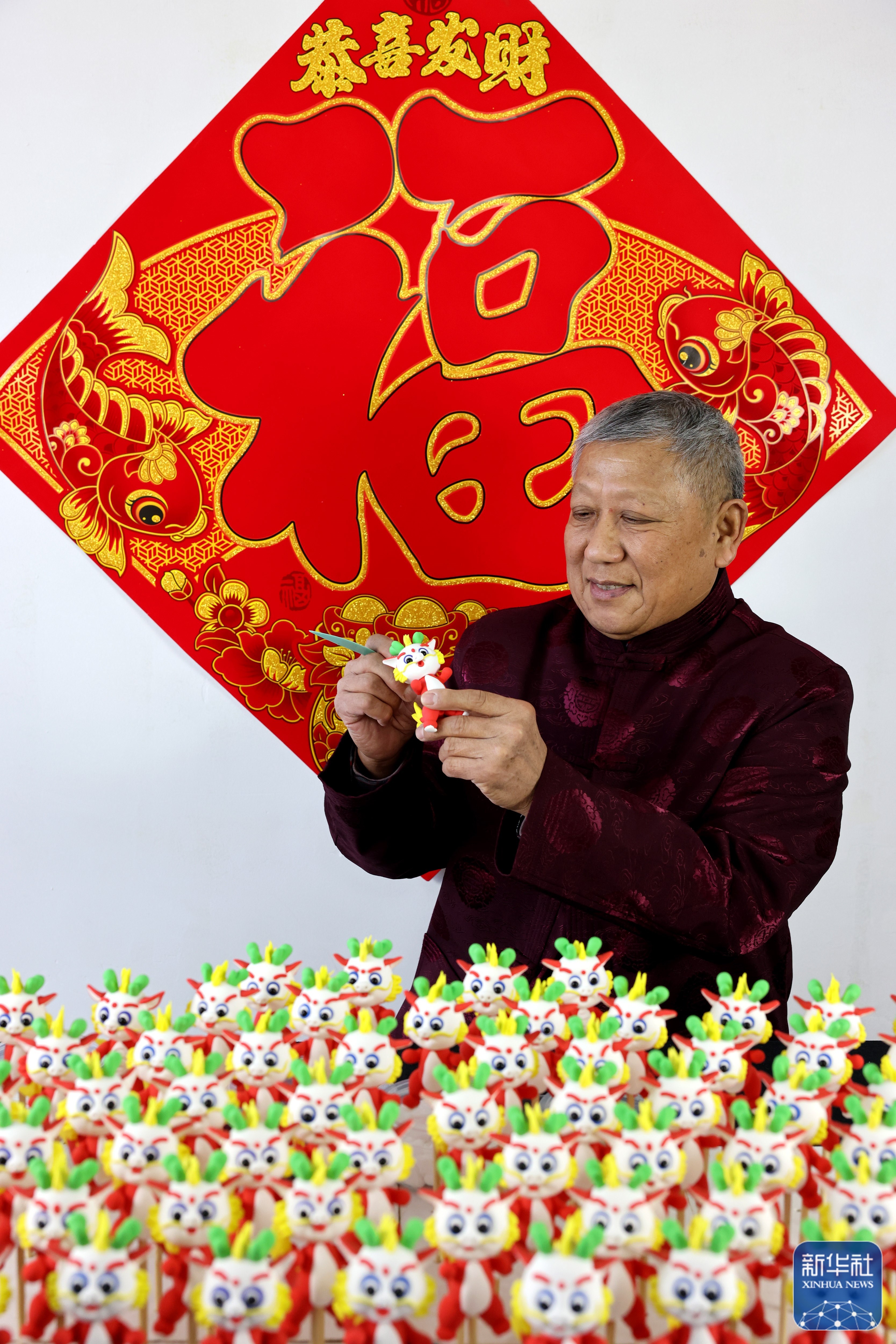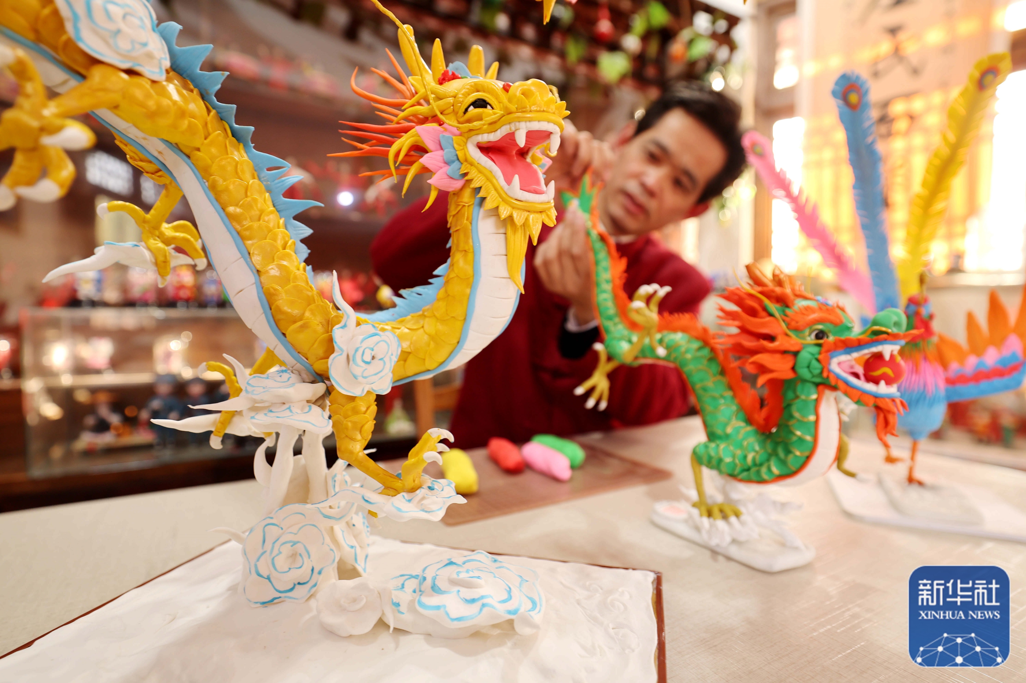 2月12日,在山东省临沂市沂南县红石寨非物质文化遗产博物馆,面塑艺人左安胜在展示生肖龙面塑作品。新华社发(王彦冰摄)