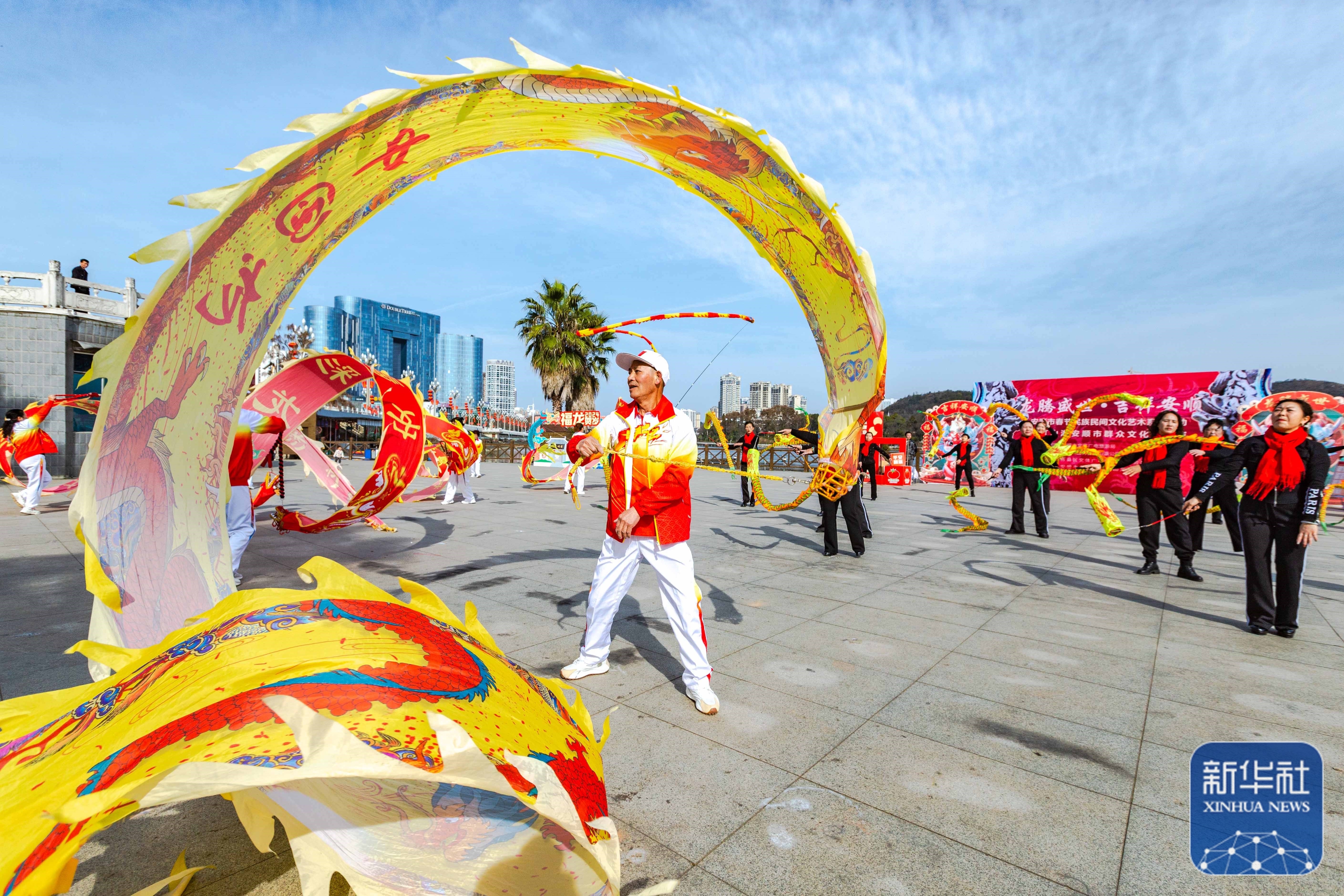 2月12日,舞龙爱好者在贵州省安顺市西秀区虹山湖公园进行舞彩龙表演。新华社发(陈熙摄)