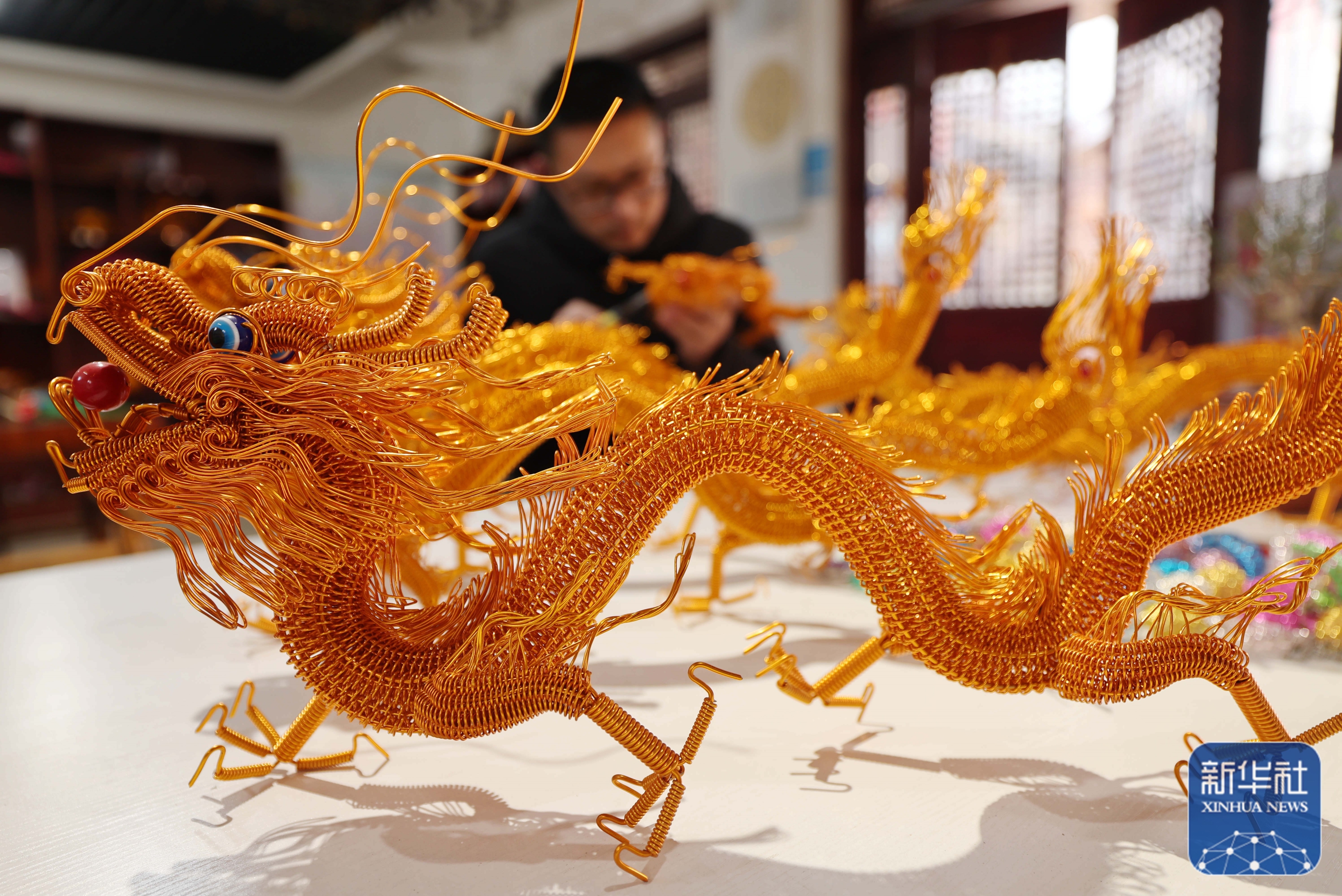 2月12日,在山东省临沂市沂南县红石寨非物质文化遗产博物馆,铝编艺人蔡兆旺在创作生肖龙铝编作品。新华社发(王彦冰摄)