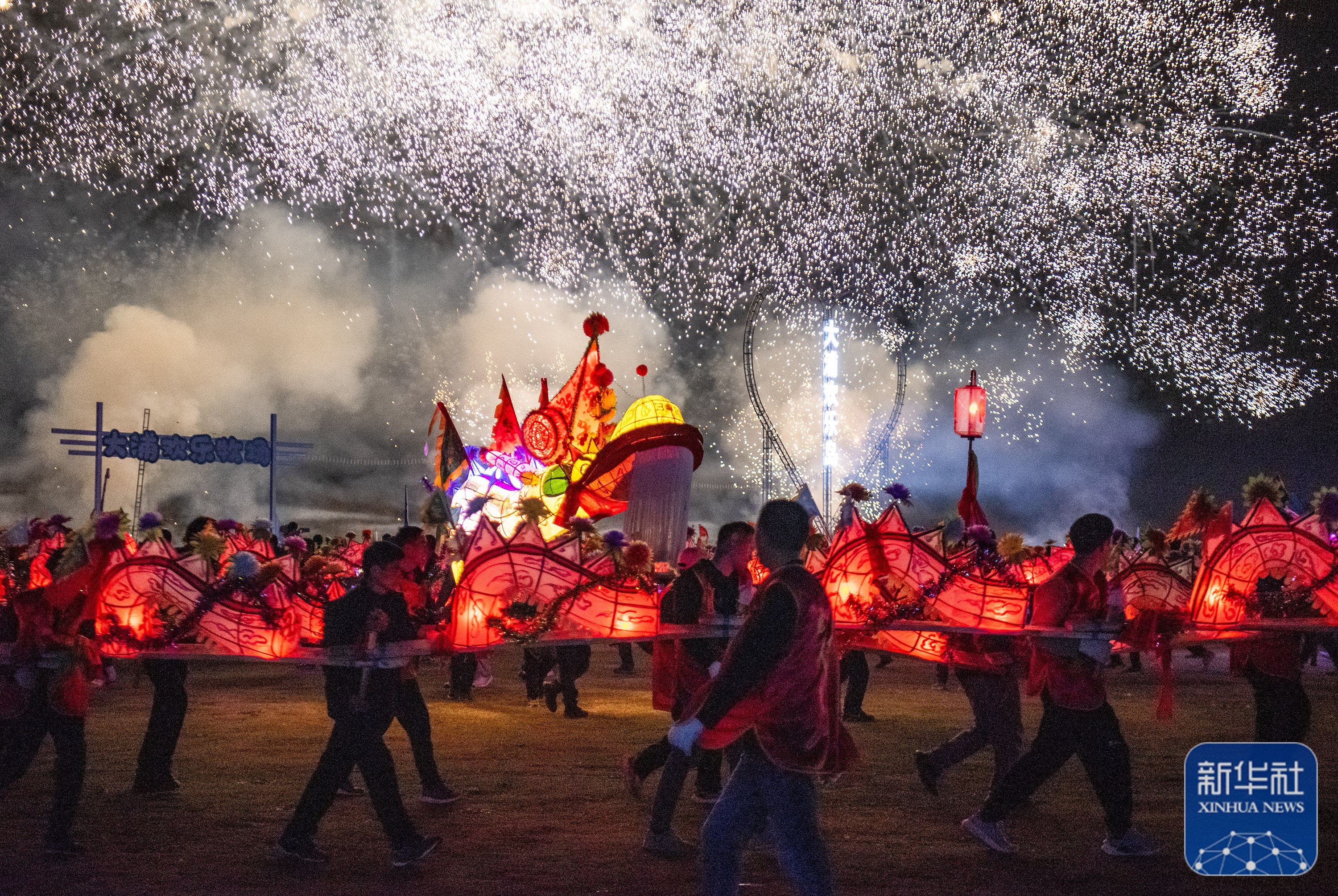 2月11日,在安徽省芜湖市南陵县许镇镇大浦乡村世界,游人欣赏龙灯非遗表演和绚丽烟花秀。新华社发(肖本祥摄)