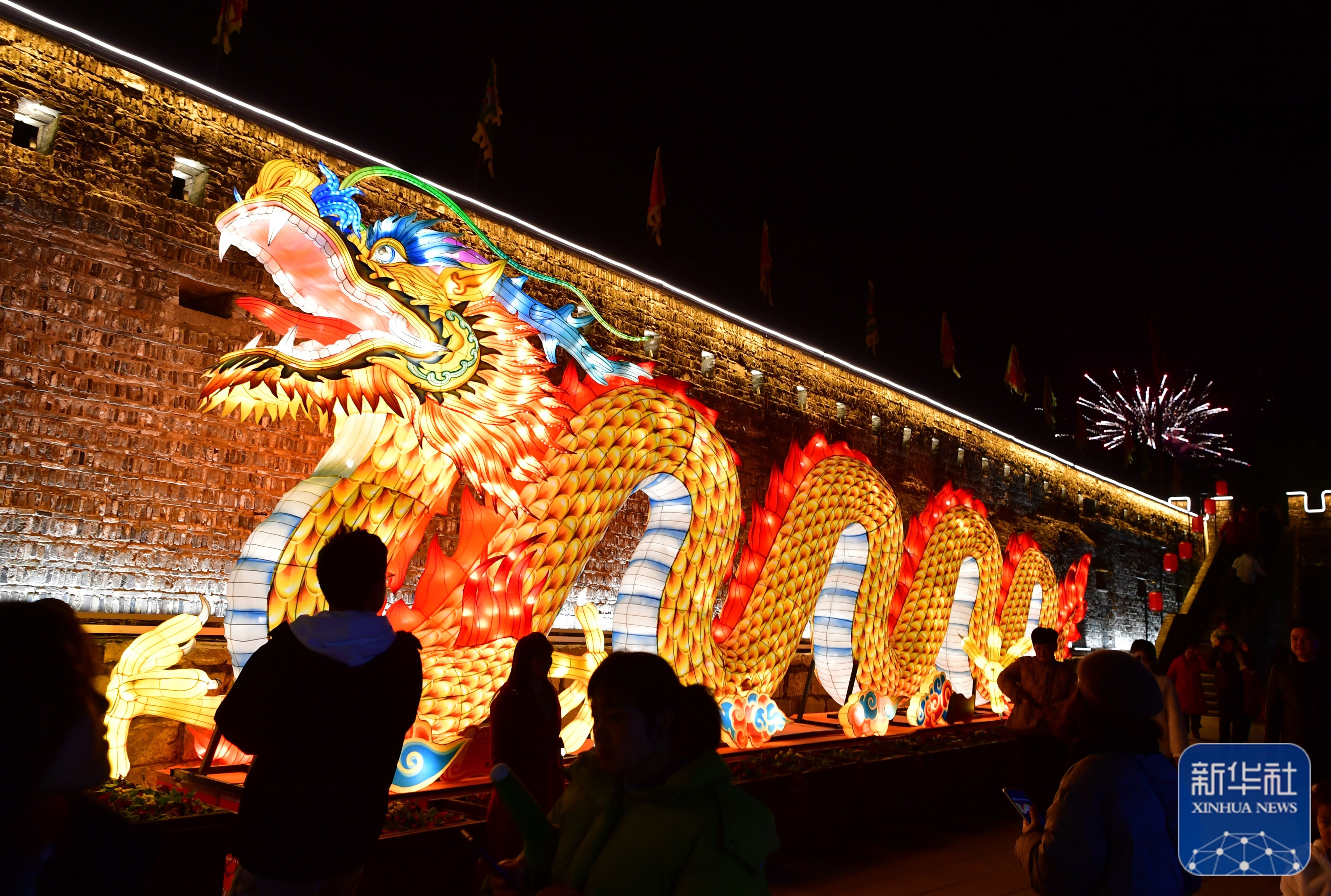 2月11日晚,游客在河南洛阳王城公园龙年灯会上参观游园。新华社记者 朱祥 摄