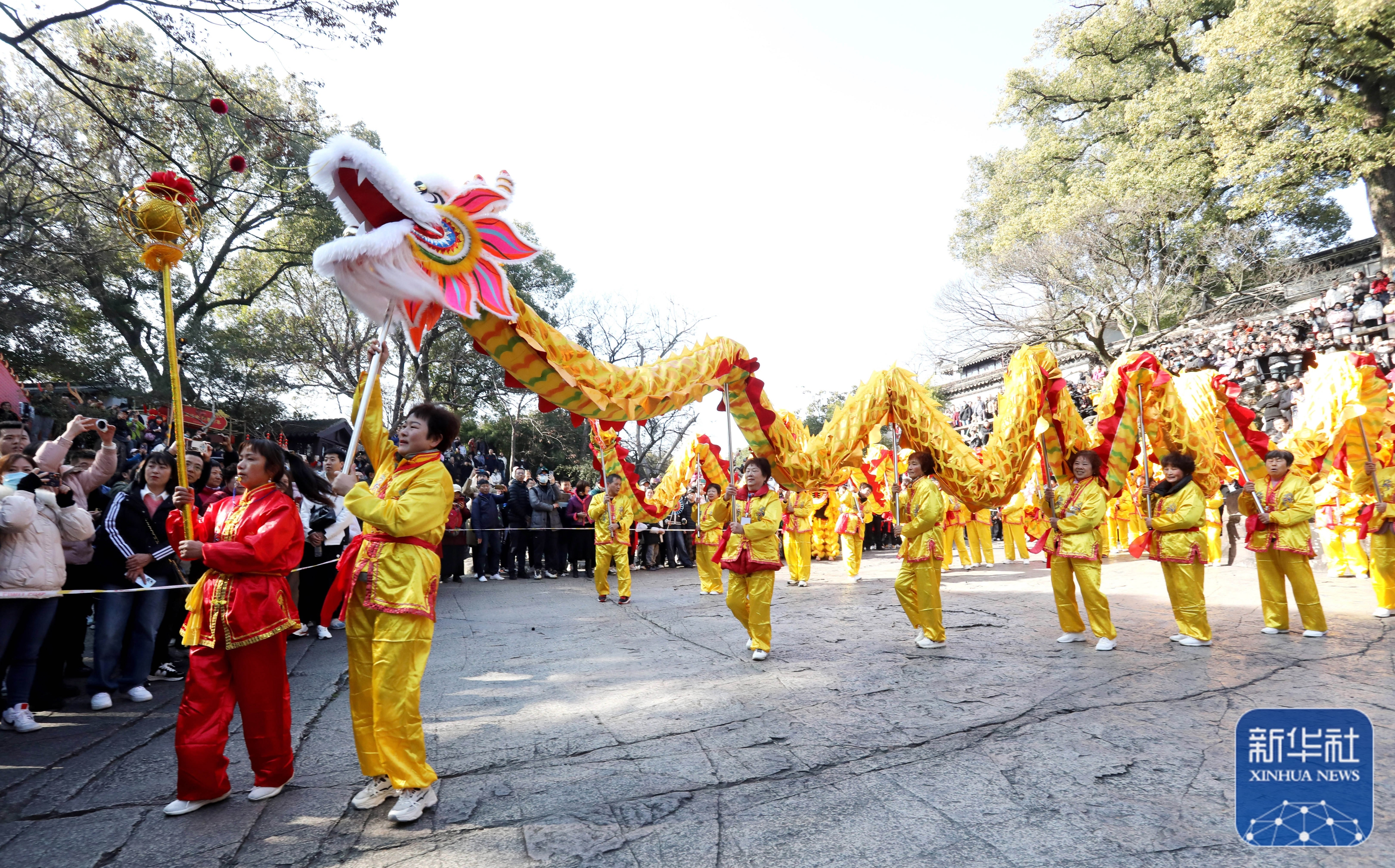 2月12日,舞龙队在江苏苏州虎丘山景区巡游。新华社发(杭兴微摄)