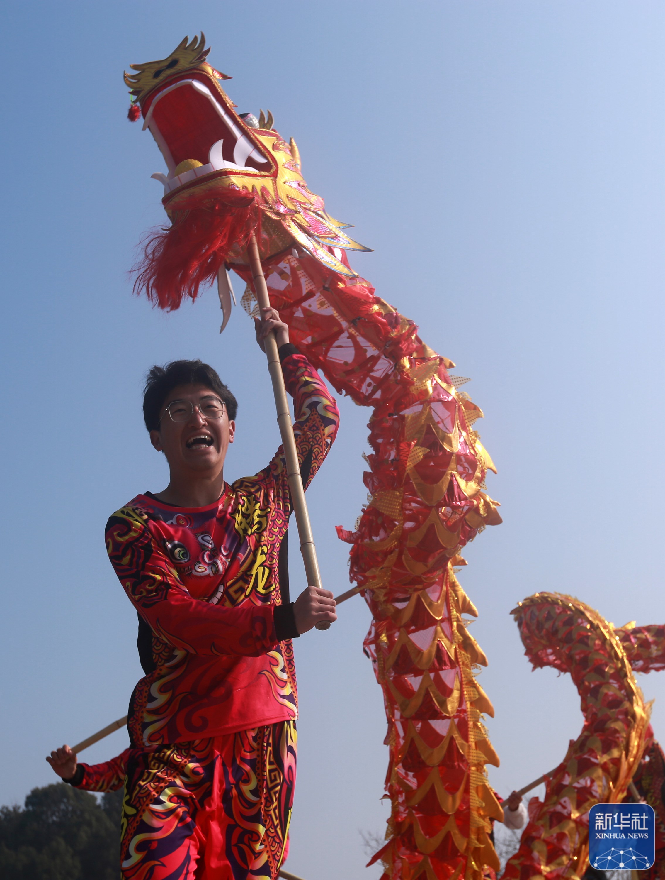 2月12日,在湖北省宜昌市秭归县屈原故里景区,民间艺人在民俗巡游队伍中舞龙送祝福。新华社发(王罡摄)