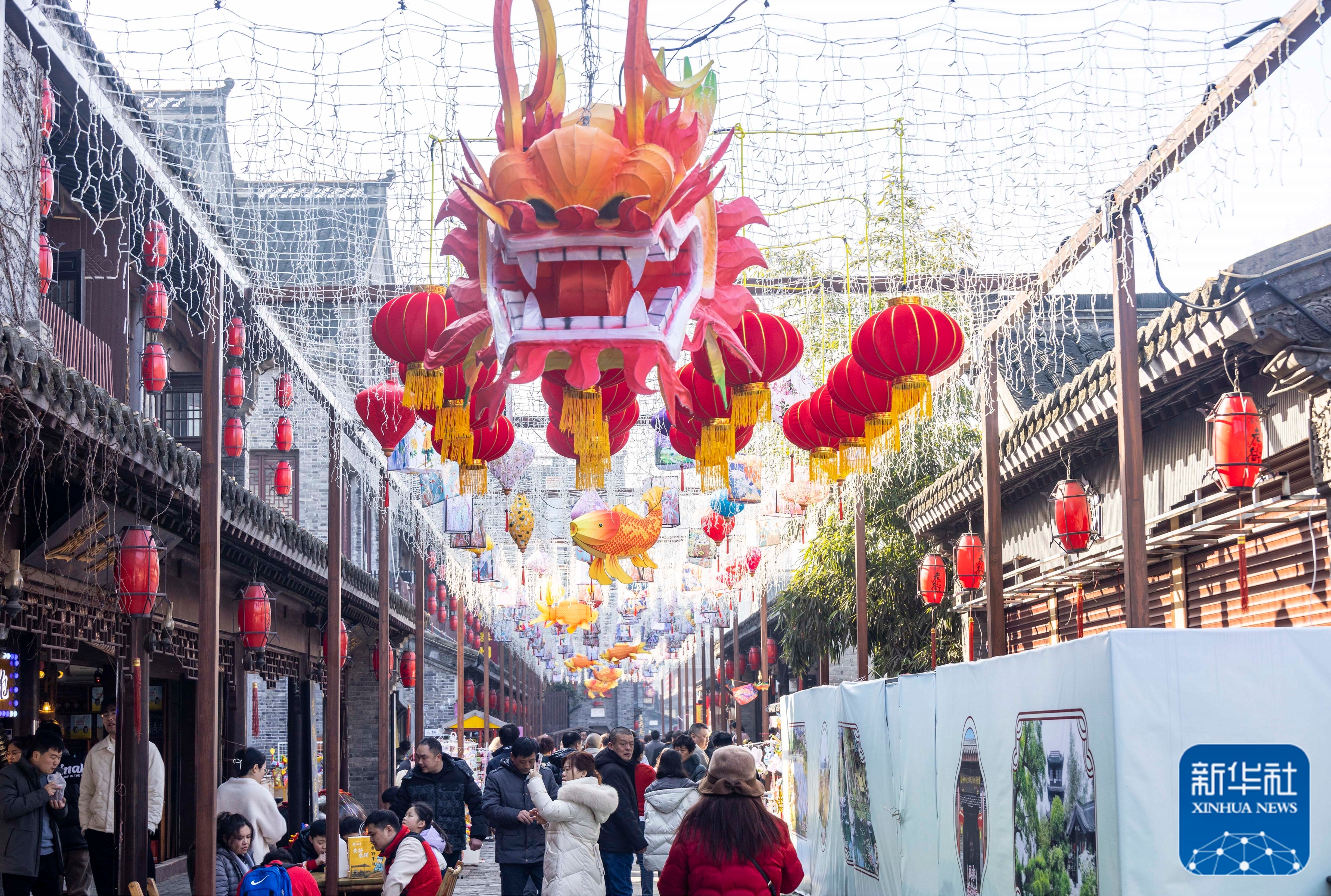 2月11日,游客在安徽省合肥市肥西县三河古镇景区观赏龙元素花灯。新华社发(徐勇摄)