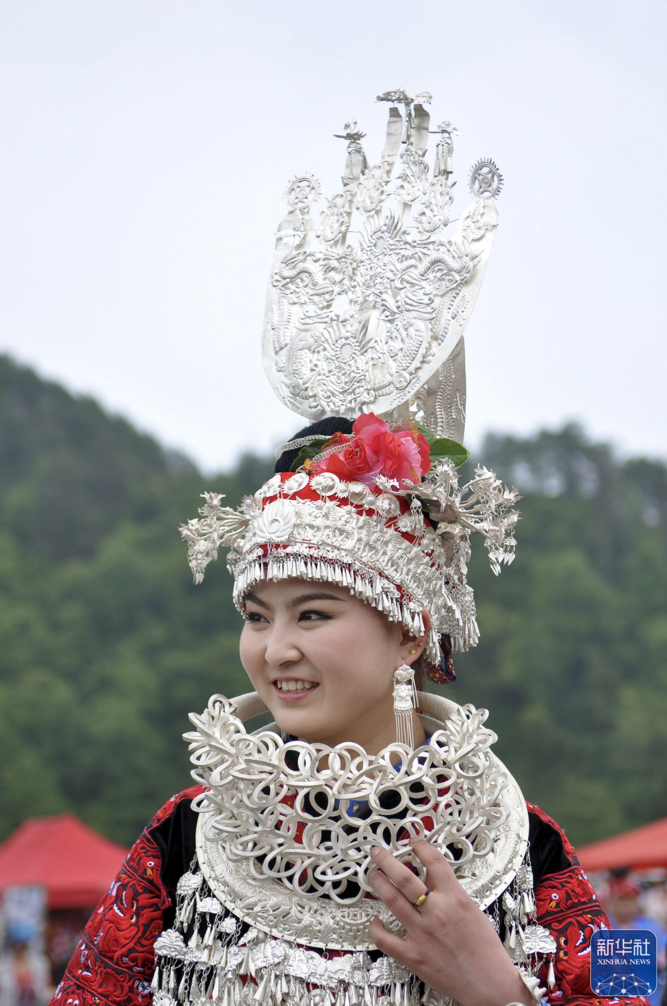2月12日,在贵州省黔东南苗族侗族自治州台江县施洞镇偏寨村,苗族姑娘戴着龙图腾的银冠去参加跳芦笙民俗活动。新华社发(吴吉斌摄)