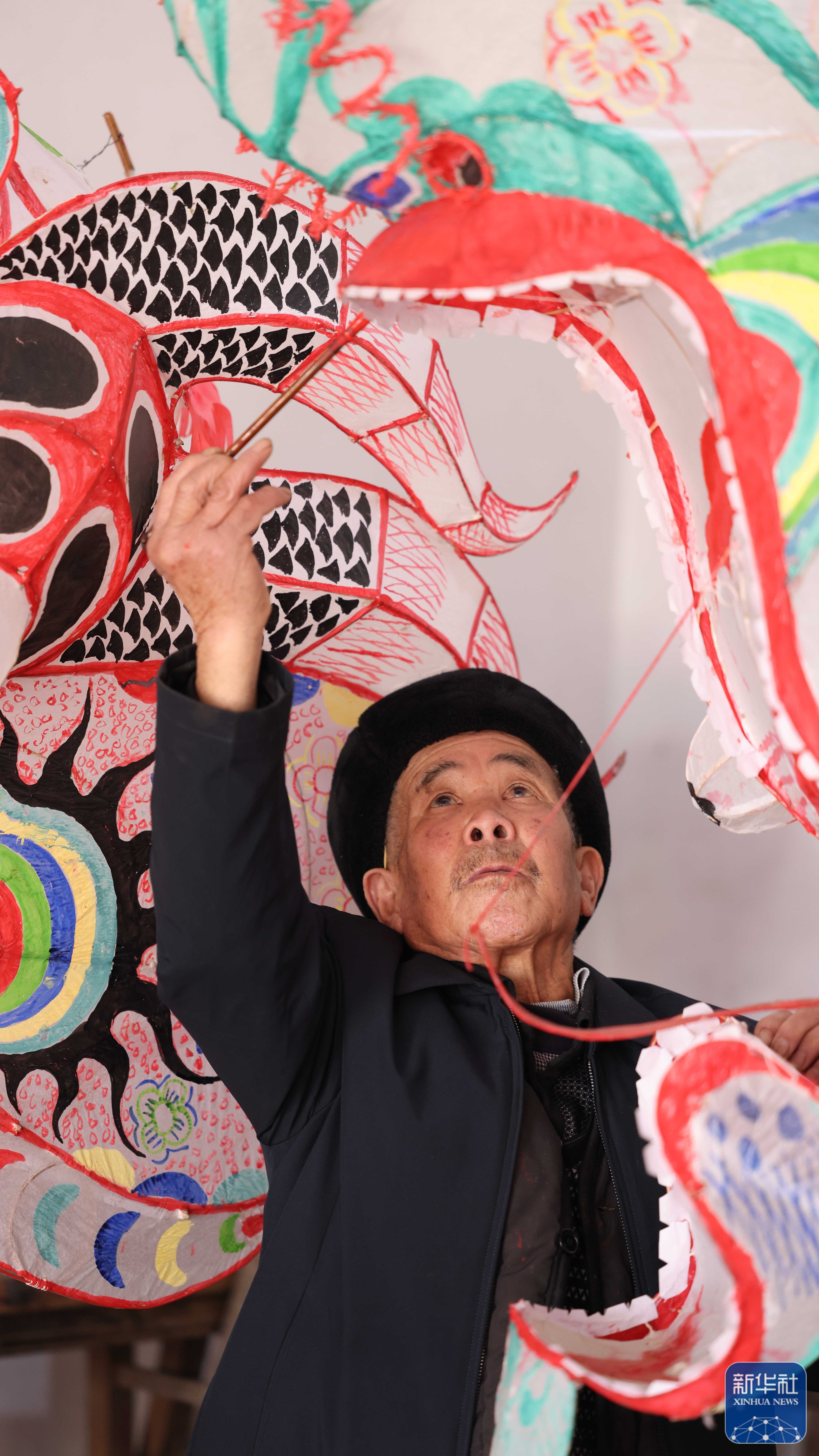 2月12日,石家庄市传统风筝制作艺人王彦州在家中制作风筝龙。新华社发(陈其保摄)