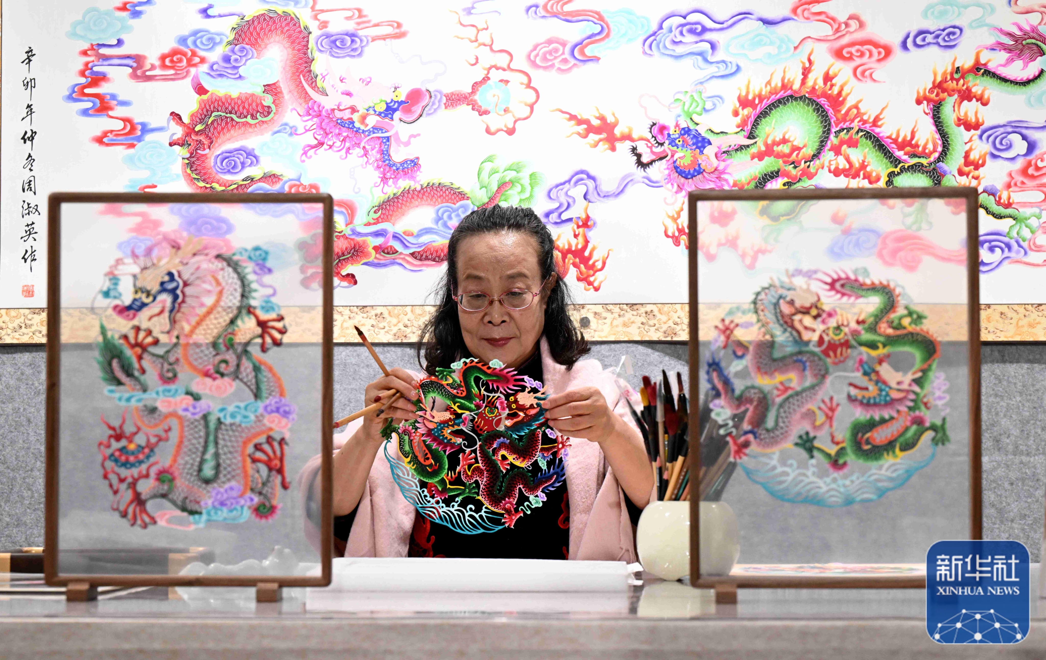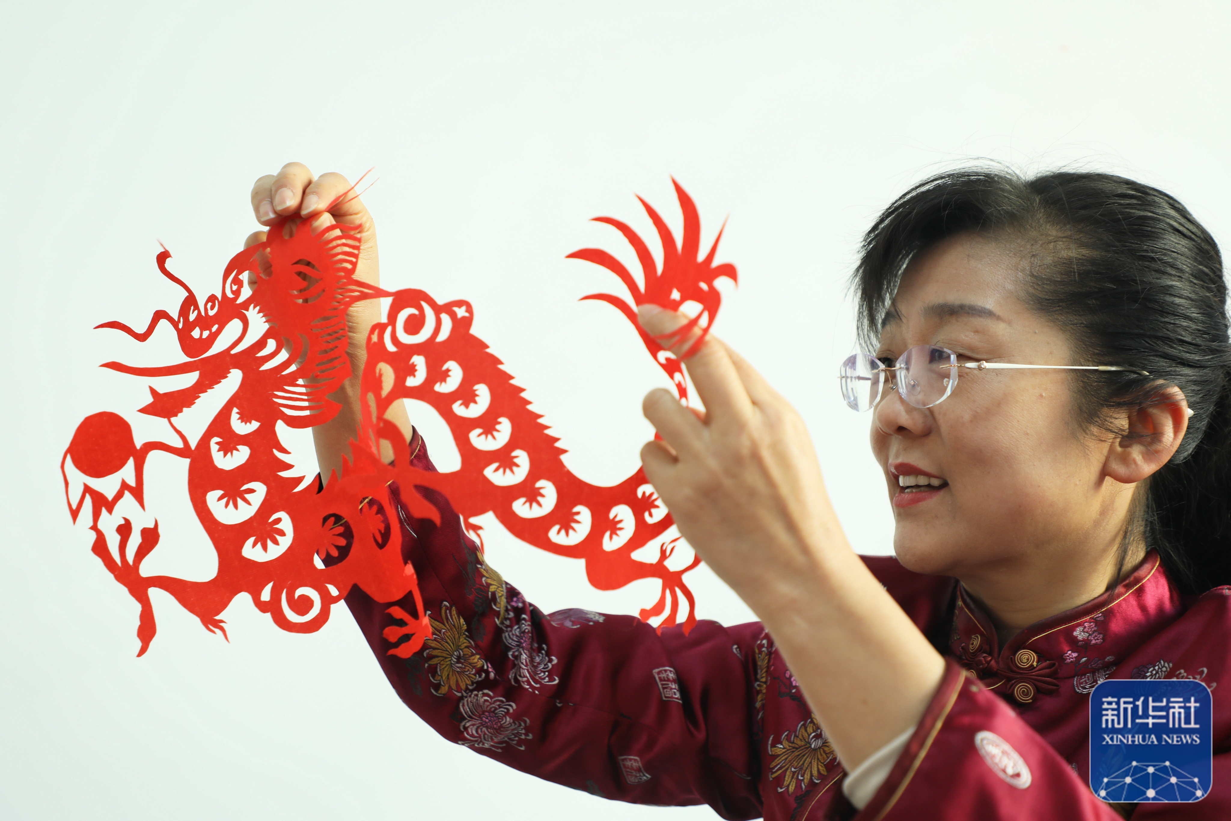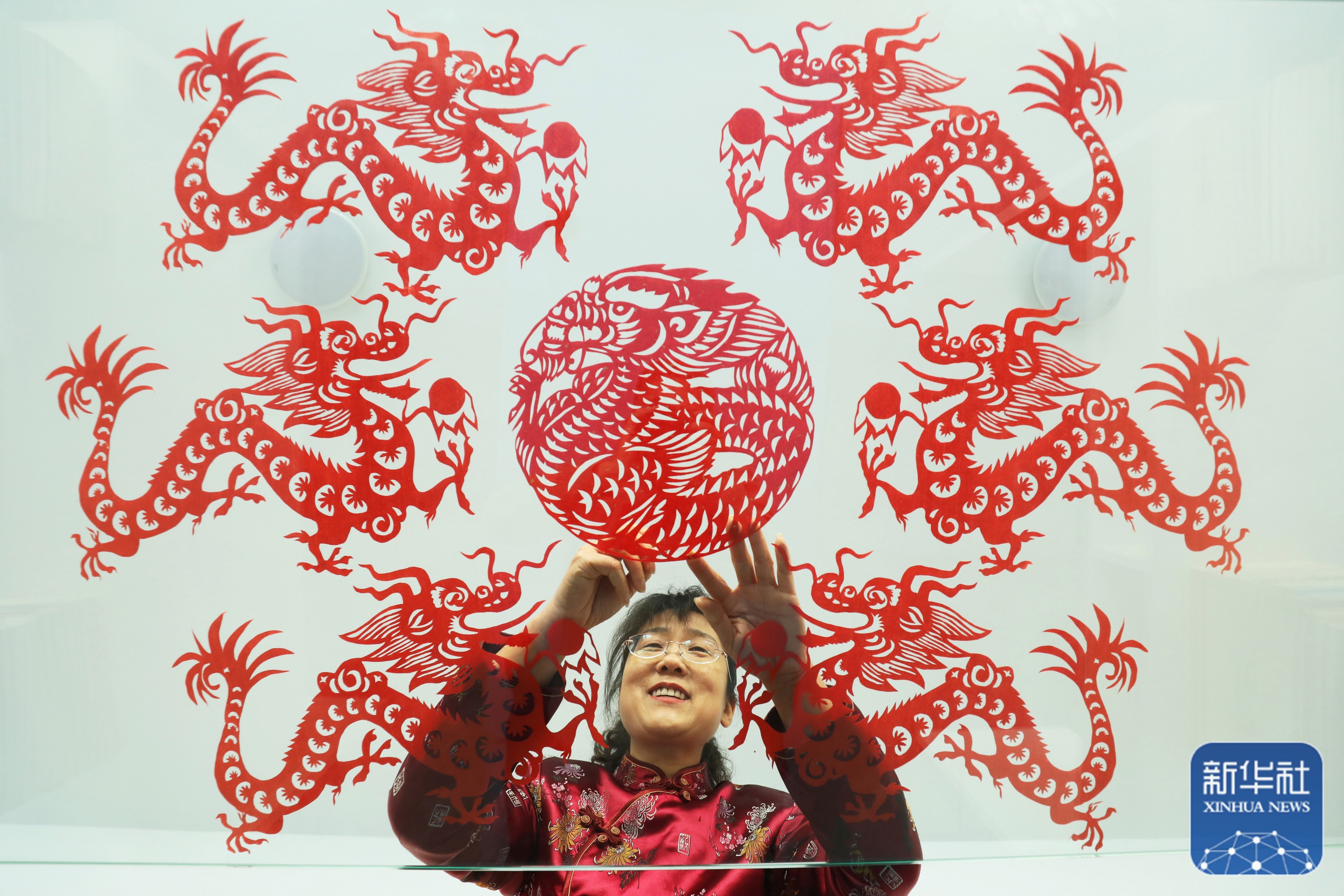 2月12日,国家级非物质文化遗产蔚县剪纸表性传承人周淑英在河北省石家庄市新华区名家工作室展示剪纸龙作品。新华社发(陈其保摄)