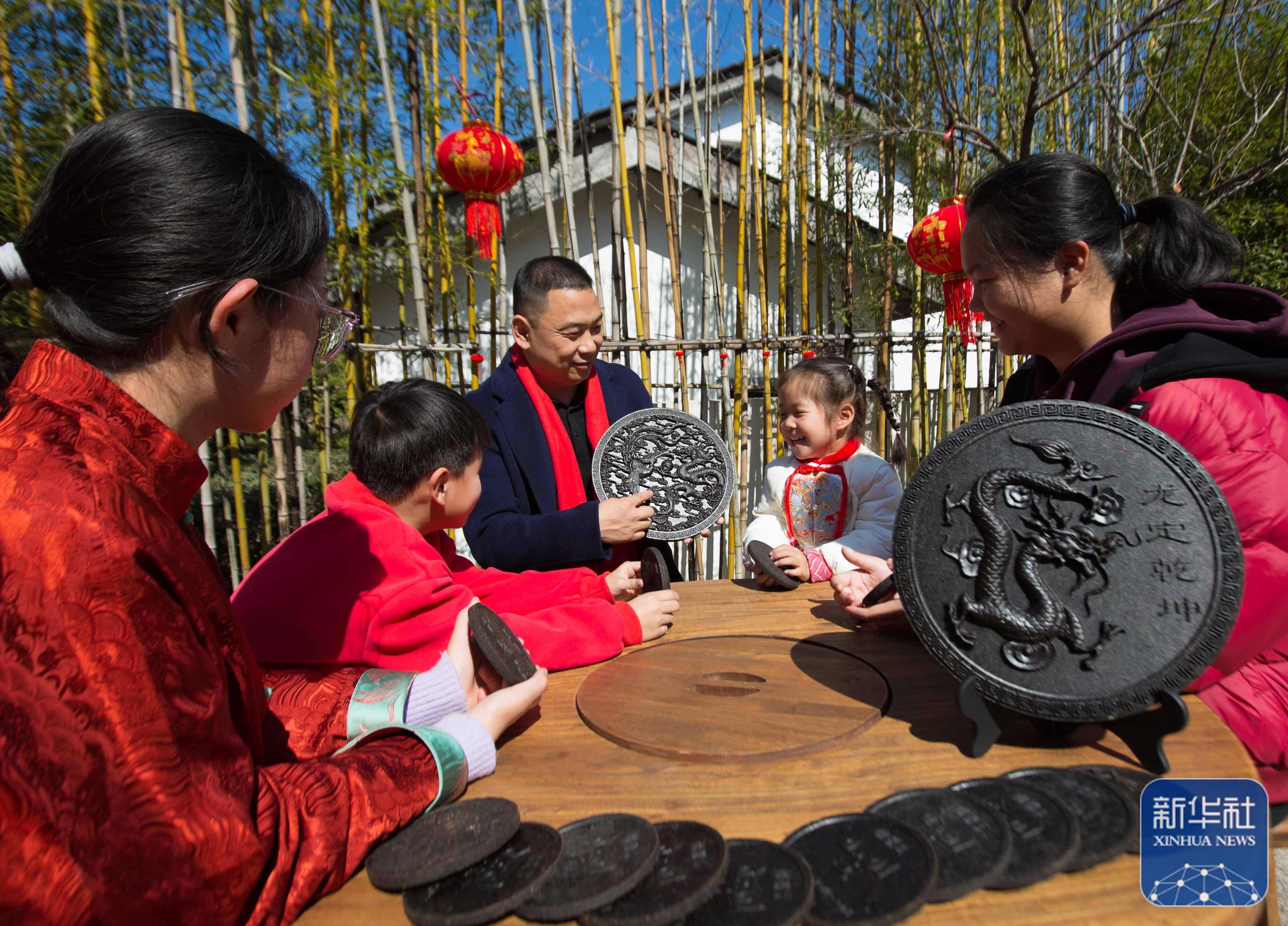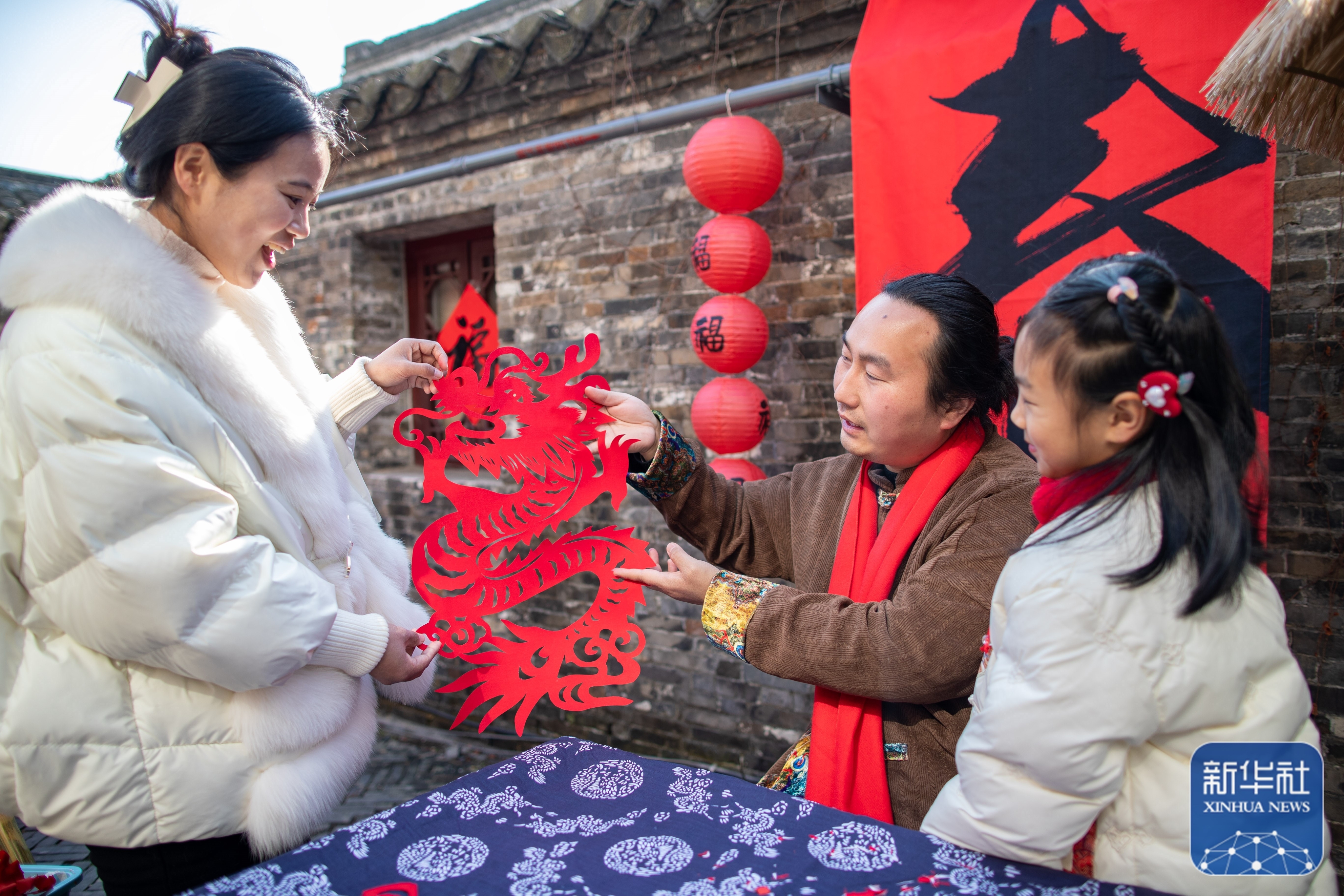 2月12日,在江苏省兴化市昭阳街道八字桥文旅休闲街区,民间艺人向市民介绍龙形剪纸作品。新华社发(周社根摄)