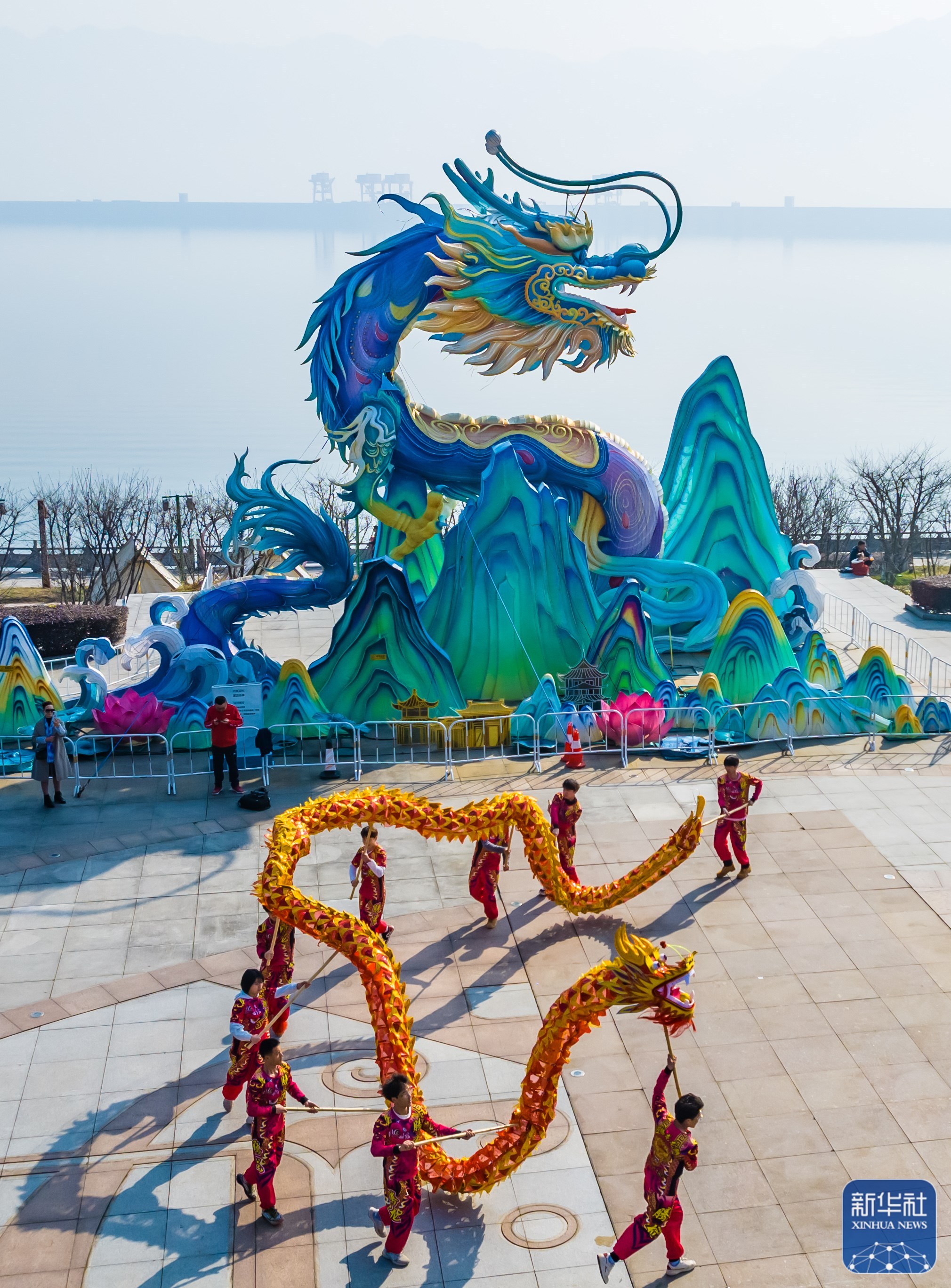 2月12日,湖北省宜昌市秭归县非遗传承人和民间艺人在三峡大坝前为当地居民和游客表演舞龙(无人机照片)。新华社发(郑家裕摄)