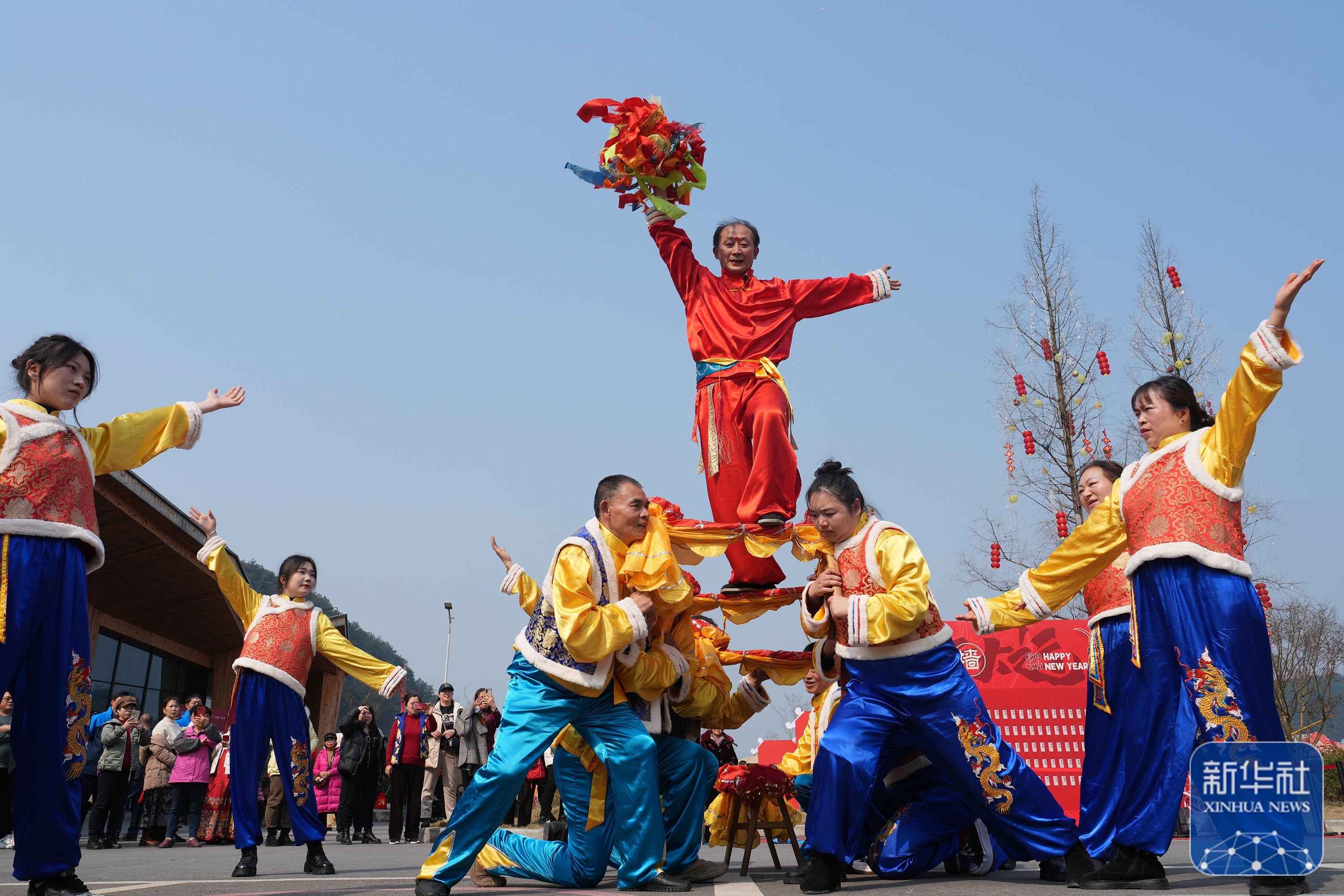 2月12日,在重庆市北碚区缙云山三花石游客中心,澄江镇北泉村的村民们在表演重庆市非物质文化遗产“北泉板凳龙”。新华社发(秦廷富摄)
