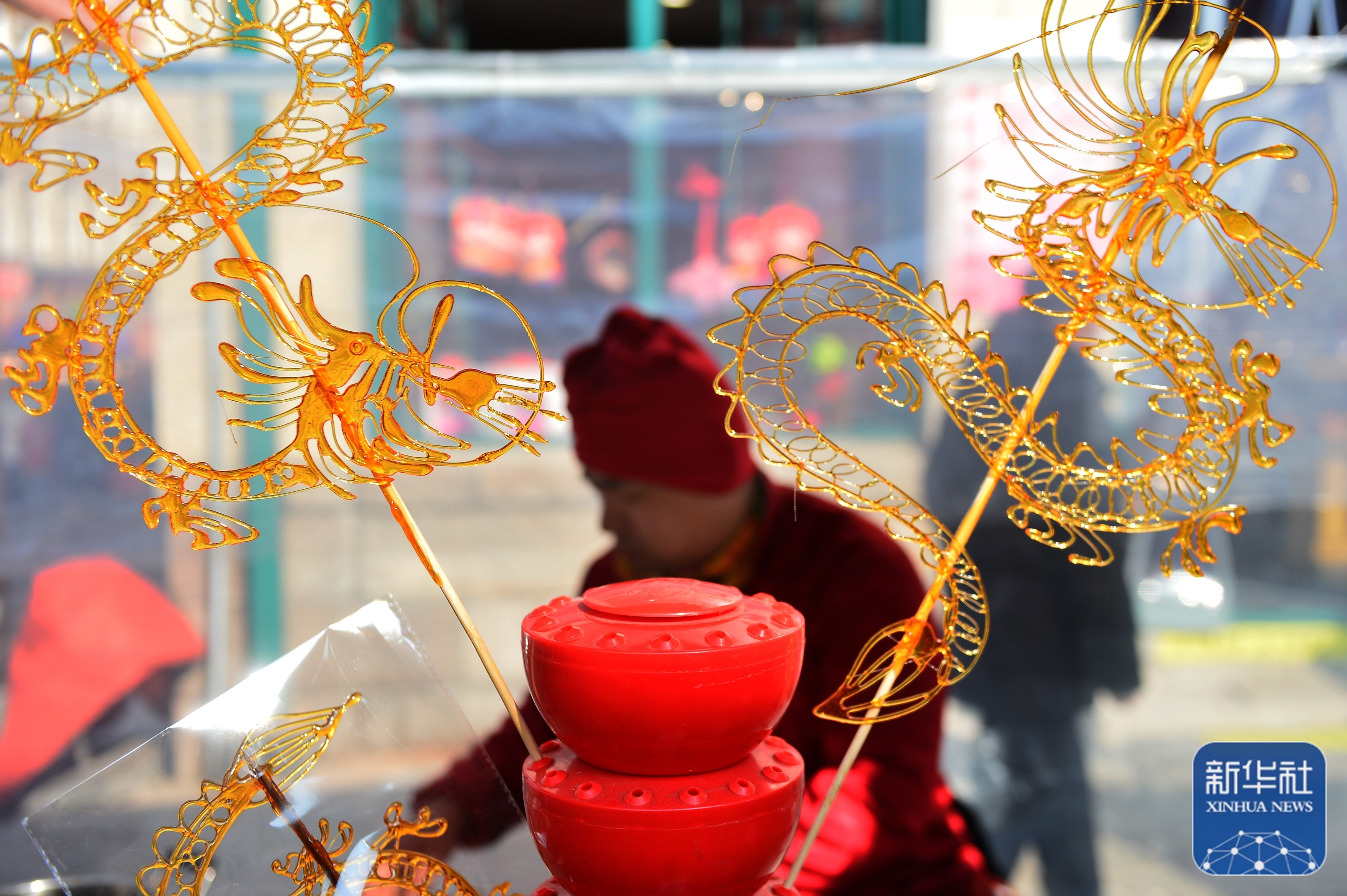 2月12日,在山东省青岛市市南区,民间艺人制作龙元素糖画。新华社发(王海滨摄)
