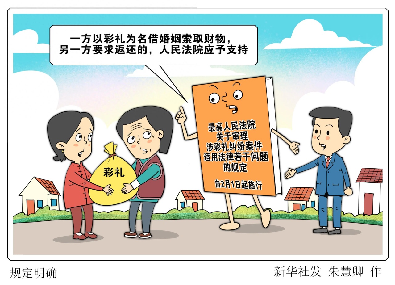 2024年2月1日,最高人民法院关于审理涉彩礼纠纷案件适用法律若干问题的规定正式施行。该规定剑指“天价彩礼”问题,受到社会关注。司法解释明确指出,一方以彩礼为名借婚姻索取财物,另一方要求返还的,人民法院应予支持。最高人民法院称,司法部门统一裁判尺度,明确标准、定分止争,对于治理“天价彩礼”有特别意义;各级人民法院接下来将通过妥善审理相关案件,以案释法、依法释理,积极配合民政、妇联等部门的前端治理工作。