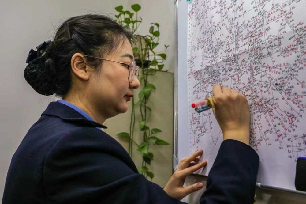 “我把这张图分成几十个小块,逐个攻破。每个小块,先记图形,再用黑笔往上填站名,最后用红笔填线路名。每天利用工作间隙和业余时间反复画,拿下这一个小块就需要四五天的时间。”赵月说,“这些小块都熟练掌握后,我又把每个小块拼到一起,捋出铁路干线、支线,形成整张大图。”