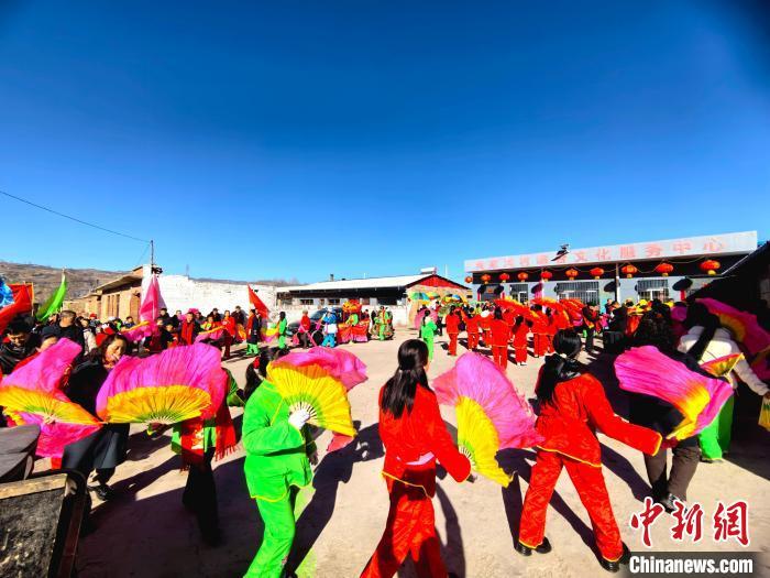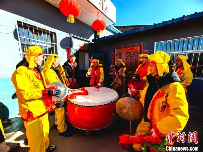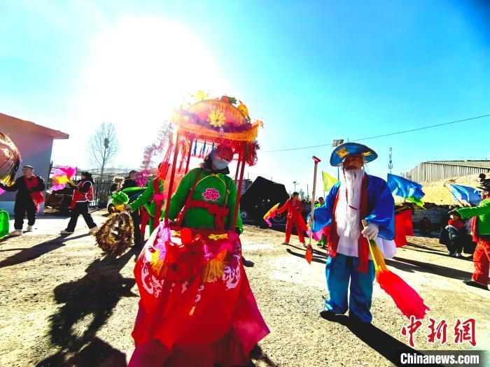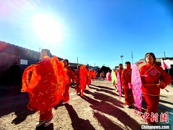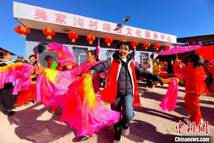 中新网吕梁2月16日电 (范丽芳 白鹏伟)正月里来是新春,火红的秧歌扭起来。春节期间,山西吕梁方山县马坊镇吴家沟村张灯结彩,150多名村民自发组织秧歌队,在热闹的正月里“扭”出别样风情。