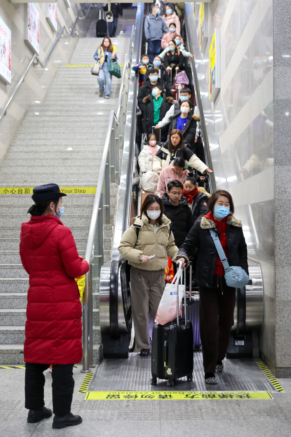 2月17日,铁路部门工作人员(中)在上海虹桥站出站口引导旅客有序出站。