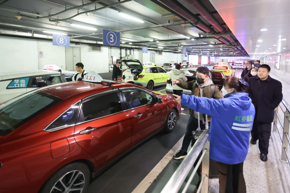 2月17日,在上海虹桥枢纽出租车上车点,工作人员引导乘客有序排队候车。