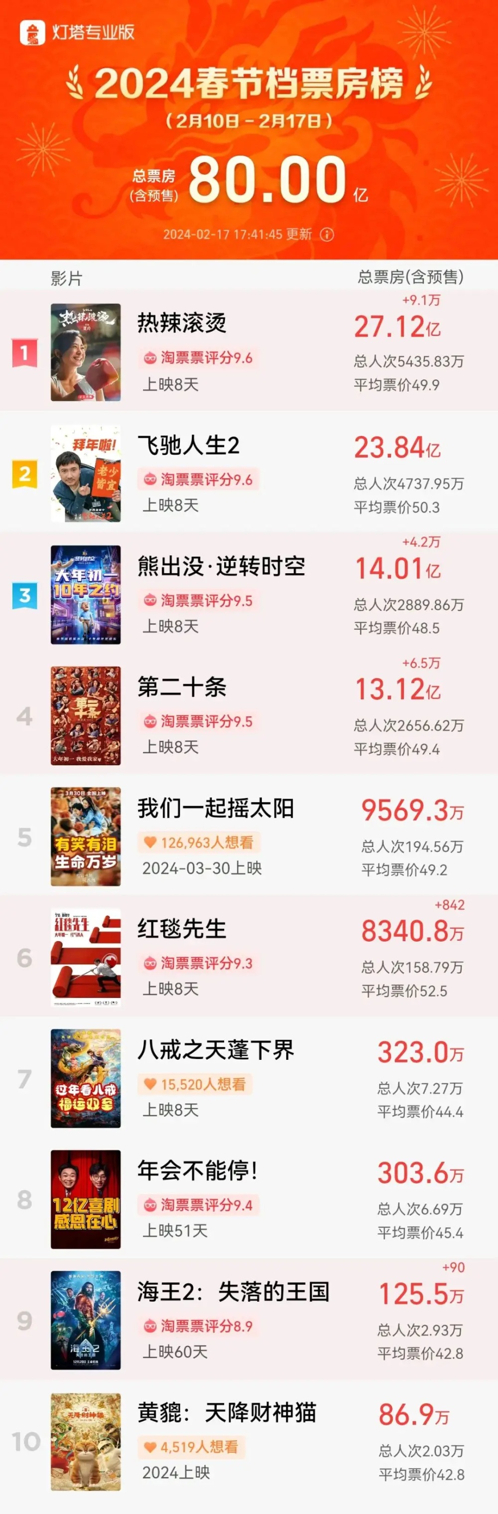 观影观演也成为这个春节假期消费大账单上的重要亮点。据灯塔专业版数据,截至2月17日下午,2024年春节档(2月10日—2月17日)档期总票房突破80亿,超过2021年春节档的78.43亿,打破中国影史春节档票房纪录。